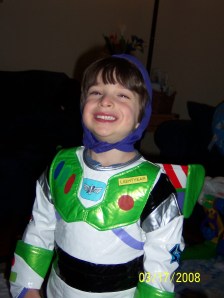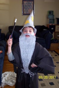 2011: All the boys had their own ideas for what they wanted to be this year. Which, of course, meant FOUR different costumes. My oldest wanted to be a wizard, and the little boys wanted to be a teddy bear, cat, and dog. Again, I got the ideas from Family Fun Magazine. I cut out spots from felt and safety-pinned them to sweatpants and sweatshirts. Then I made headbands with attached ears made of sticky felt. The little boys still love to wear their animal ear headbands. My oldest also still loves to dress up in his wizard costume.