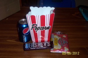 Movie night: My friend Wendy used a popcorn box and then included microwave popcorn, a can of soda and a Hershey’s chocolate bar.