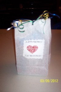 As you know, I am very conscientious about recycling and reusing. I always try to find a container or bag that can be reused. Some examples of containers I have used in the past have included: cloth drawstring bags, plastic containers (like Gladware), and soft plastic square boxes (from Garden Ridge). This year we used plastic cups from the dollar store.