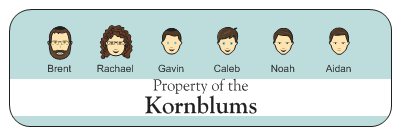 ∞ Gift labels: I made some (on Inkgarden) with our initial at the top and then the text “From the Kornblum Family / (our first names on the next line).” I can then use them in place of a card or sticky label on a gift (birthdays, Shabbos invite, etc.).
