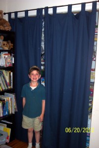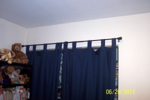 We went to Lowe’s and picked out some dark, all-purpose curtains that would stand up to a child pulling on them. We got the hardware and rod to hang them on. It ended up taking my husband only 15-30 minutes to put the whole thing up. Here are the results: