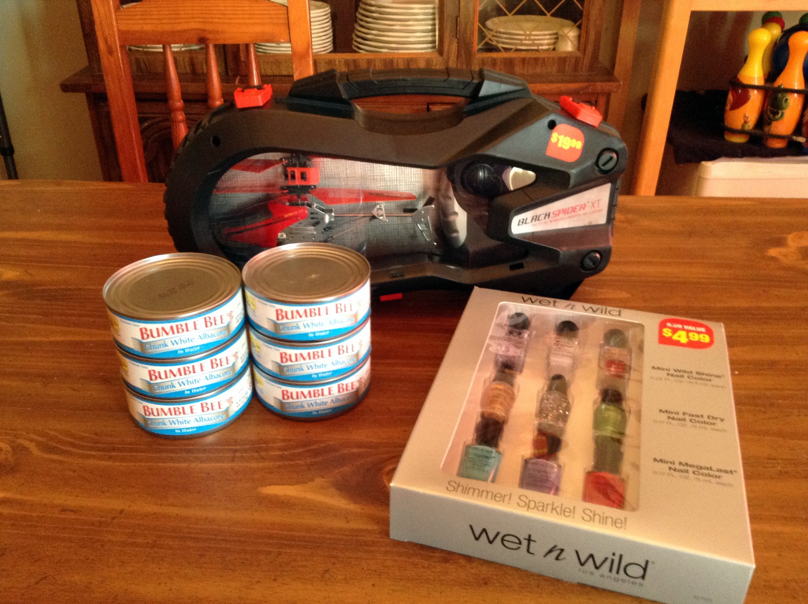 Other sale items: Tuna for $.66 a can ($.69 regularly at Aldi, but for name brand it was a savings), a polish gift set for a friend ($3.88 on sale, $3 ExtraBucks back = $.88), and a remote control helicopter for my older son for Chanukah ($8.88, regularly $19.99).