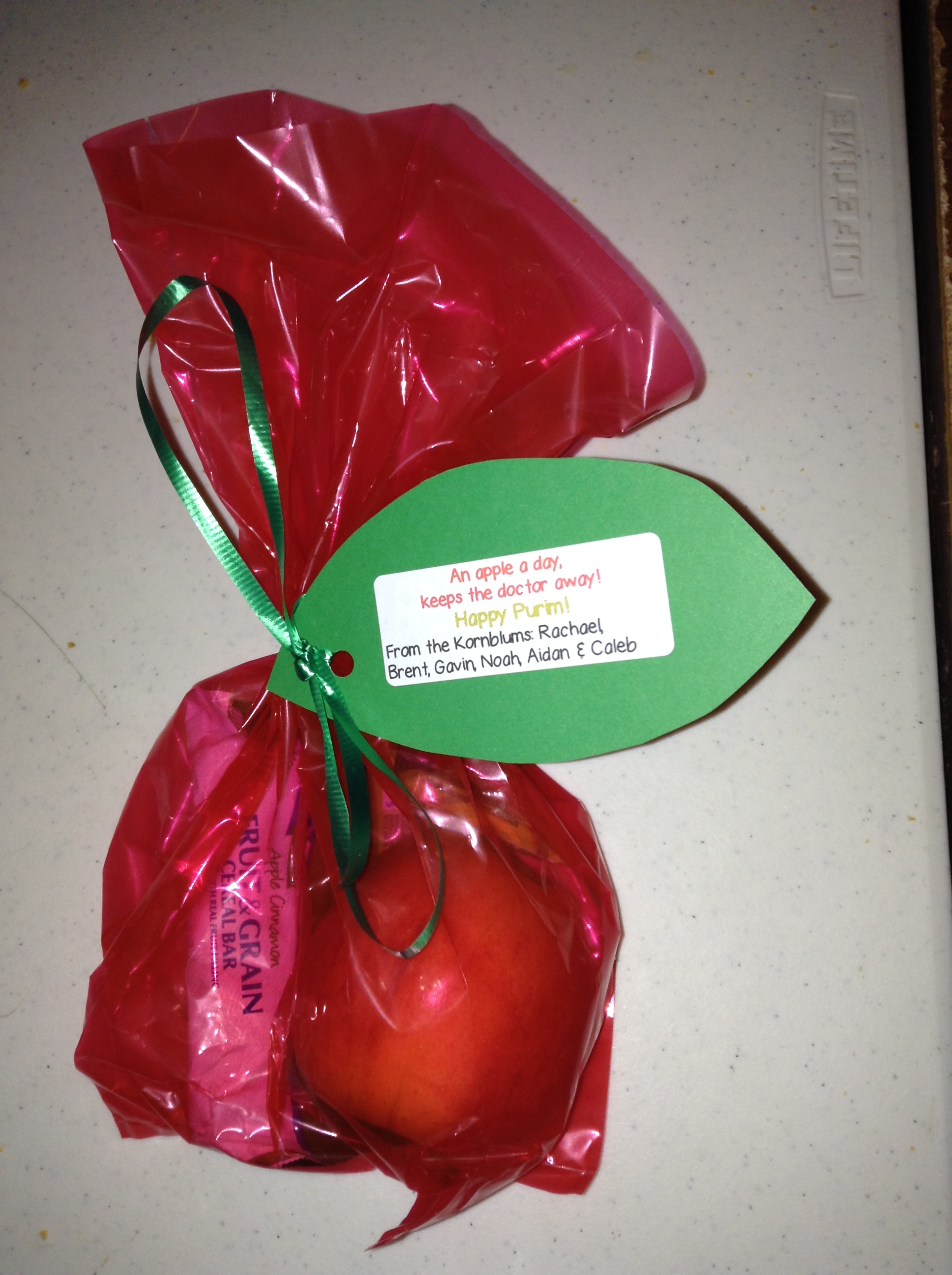 Our own shaloch manos (mishloach manot) last year were made to be inexpensive, with a bit of creativity. With job struggles for us both, we needed to keep our costs down. So we went with an apple theme – red gift bag (from Party City), green leaves made from scrapbooking paper, labels printed on the computer, green ribbon, apples, apple laffy taffy and apple cereal bars (from Aldi). Simple, but cute.