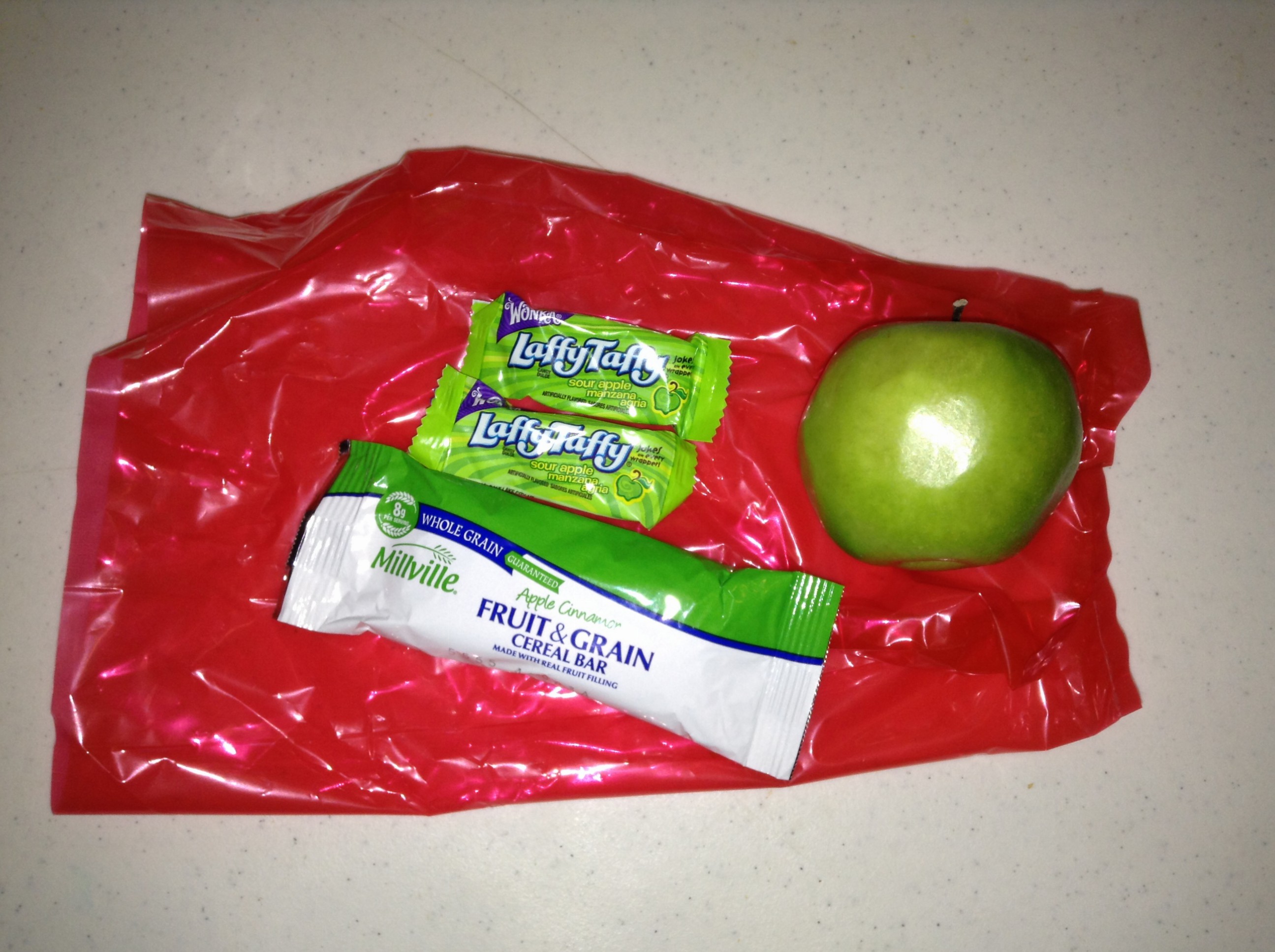 Superhero theme – family initial superhero logo, blue paper bag, poem with foods to match – Powerade, Go Bars, celery, Popchips and Gushers. (Great idea Jessi and Arik!)