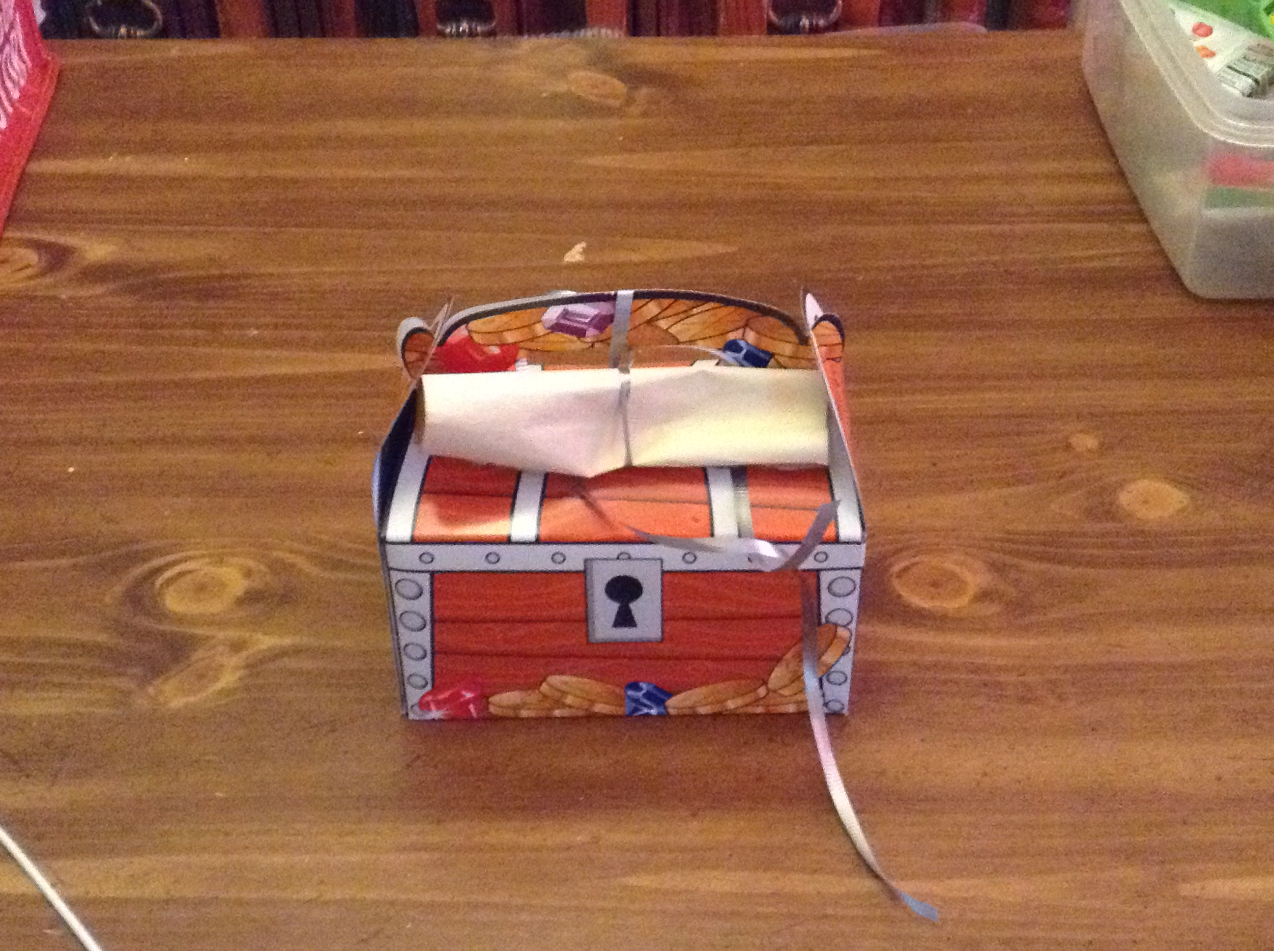 Pirate treasure theme – cardboard treasure box, goodies inside, scroll with poem on top