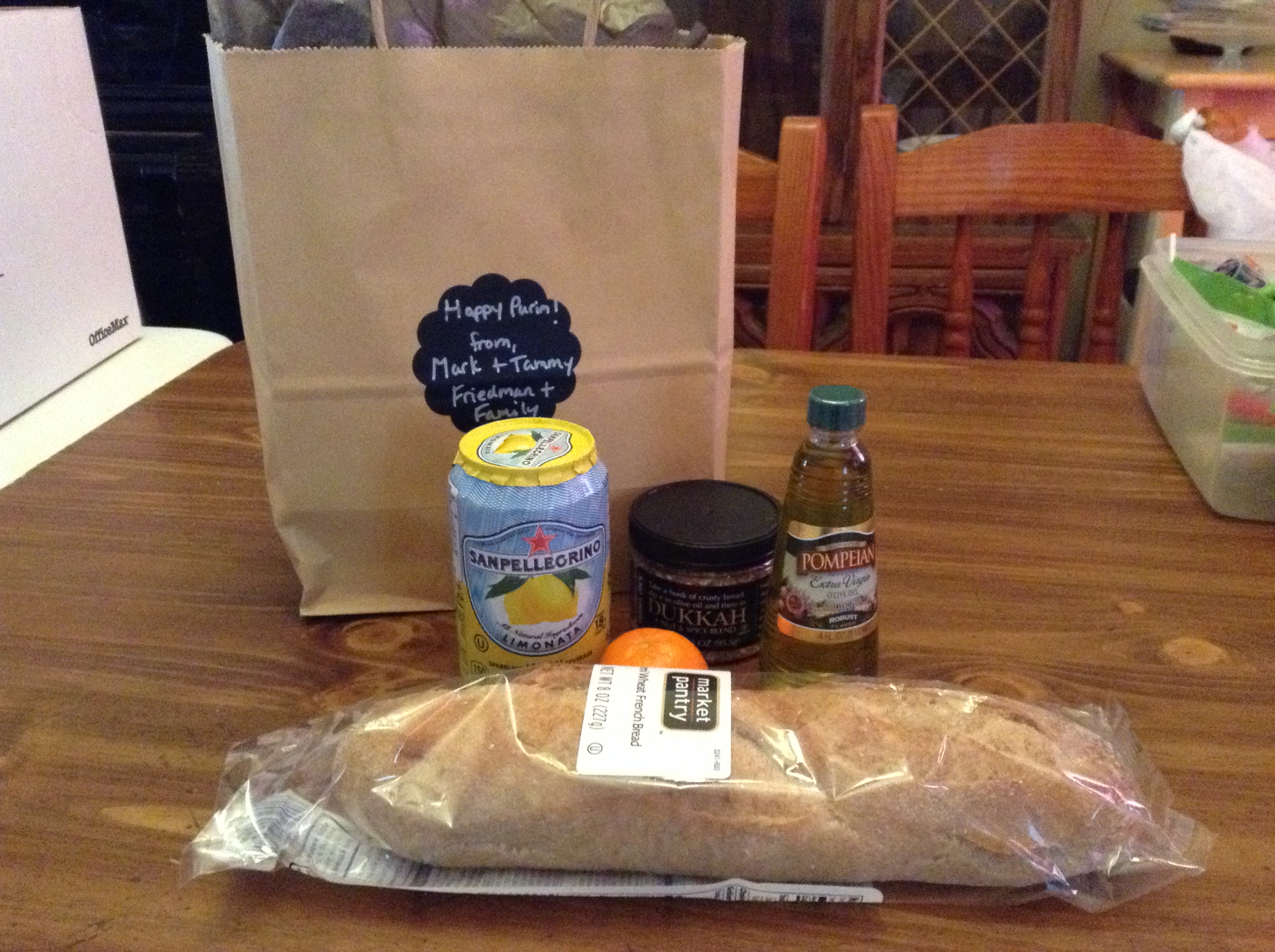 Italian delicacy theme – Pellegrino drink, dakkah spread, olive oil, and Italian bread. Such a special yummy treat and a beautiful, elegant presentation! (Great idea Tammy & Mark!)