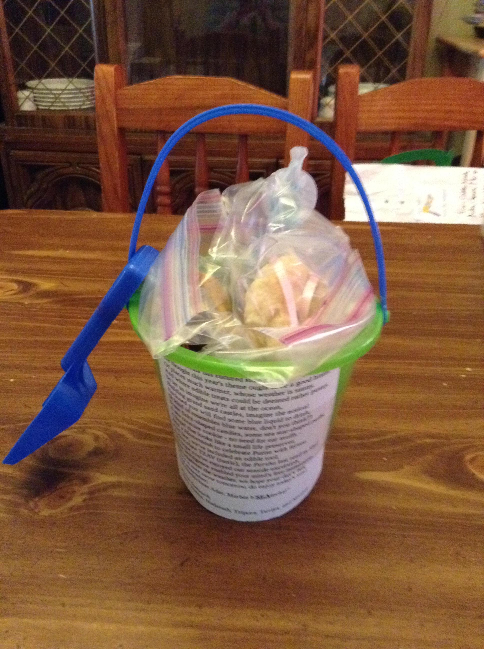 Beach theme – pail and shovel, cute poem with food to match (Great idea Amy and Joshua!)