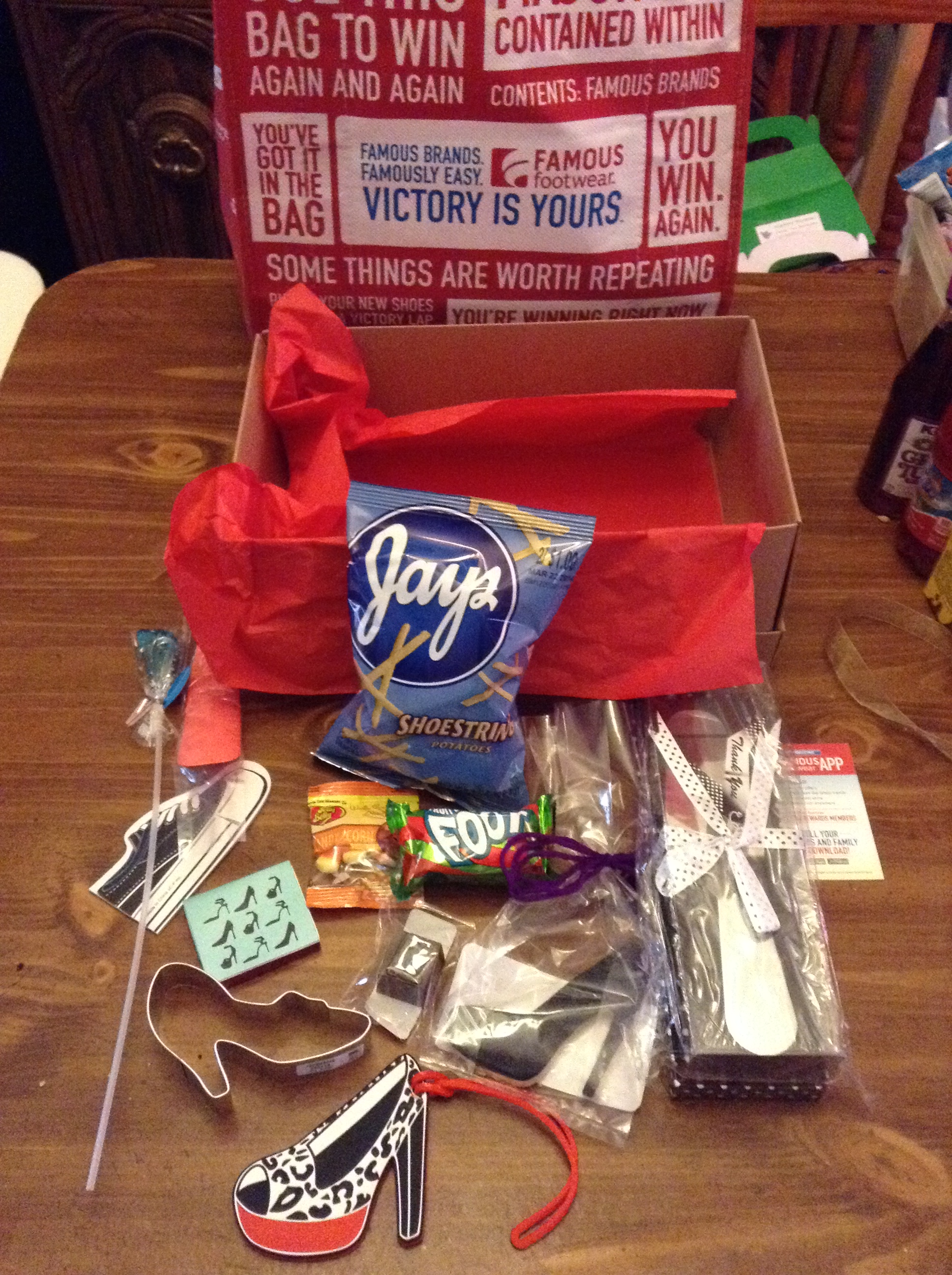Shoe theme – The sisterhood of one of the local shuls always does beautiful, elaborate shaloch manos as a fundraiser. They come up with wonderful themes each year. Last year’s was shoes. The container was a shoebox of course, and inside were a shoe cookie cutter, a shoe-shaped cake knife, shoe luggage tag, a shoe notepad, shoestring potatoes, fruit by the foot, a shoe-shaped cookie, and more. They even put it all in a canvas bag from Famous Footwear!
