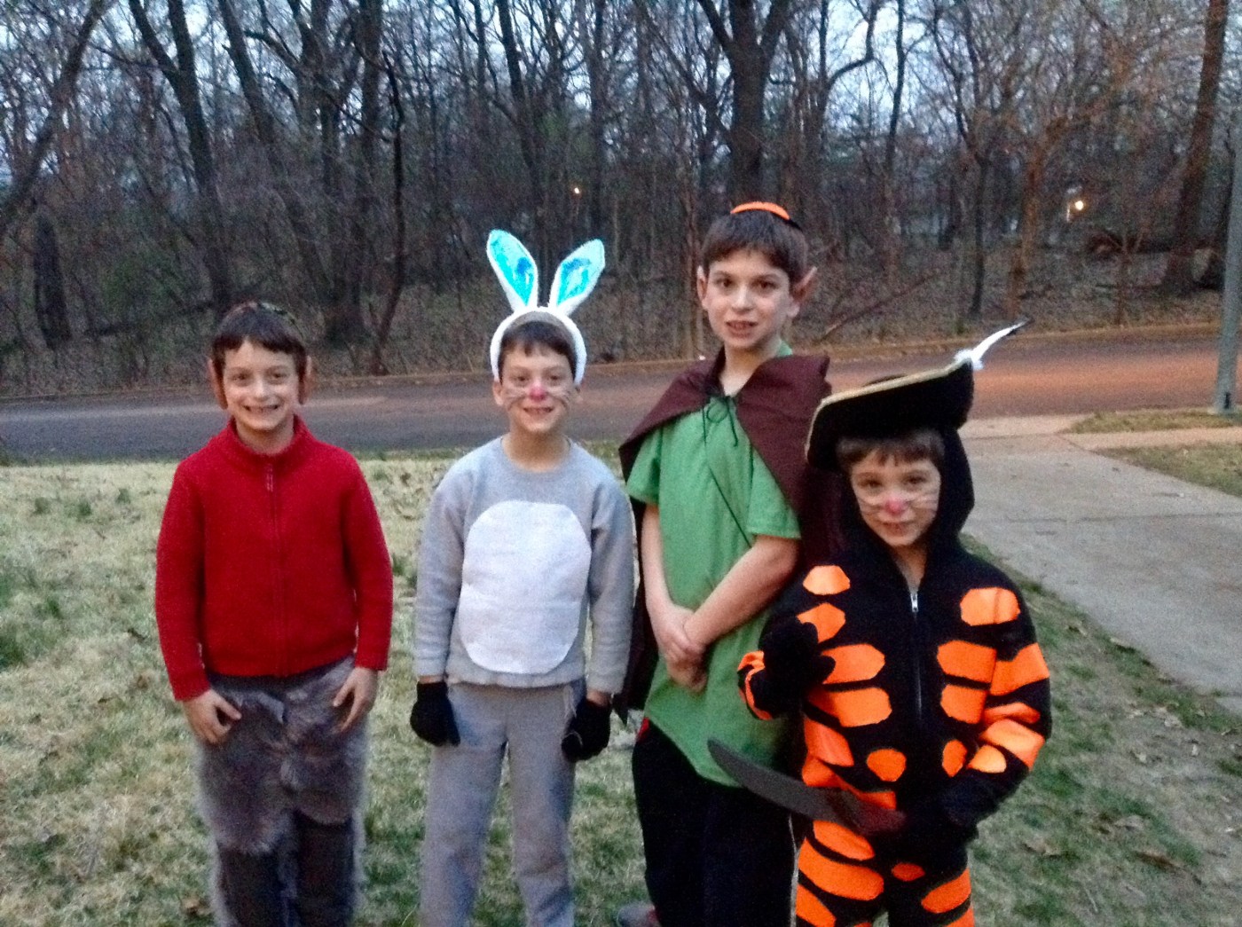 My boys each had their own ideas for last year’s costumes. A, our middle triplet, wanted to be Mr. Tumnus from the Narnia books. N, my oldest triplet, wanted to be a bunny. G, my then 12-year-old, wanted to be a Lord of the Rings elf, and C, my youngest triplet, wanted to be Puss in Boots.