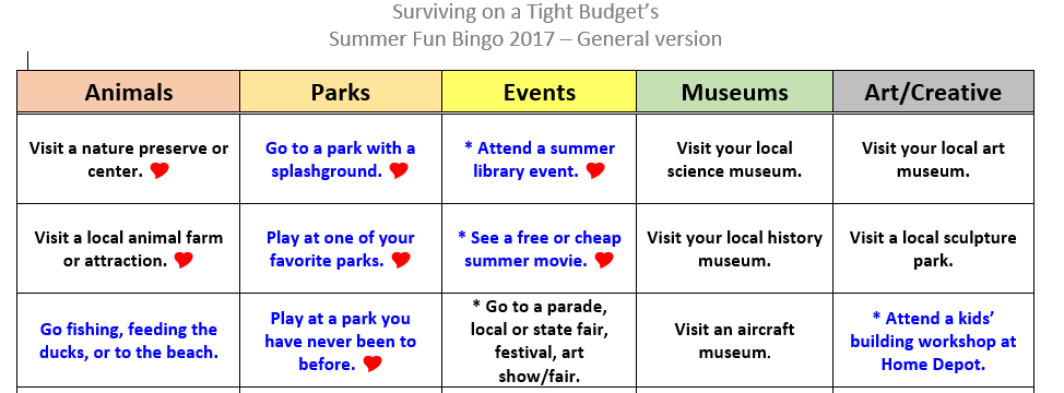 Keeping them occupied is not always cheap, though. So several years ago I researched and created my own Summer Bingo game with various choices of what we could do during the summer and how much each cost. Of course, we spend time at home engaged in various activities, but getting out of the house at least once a day is good for everyone!
