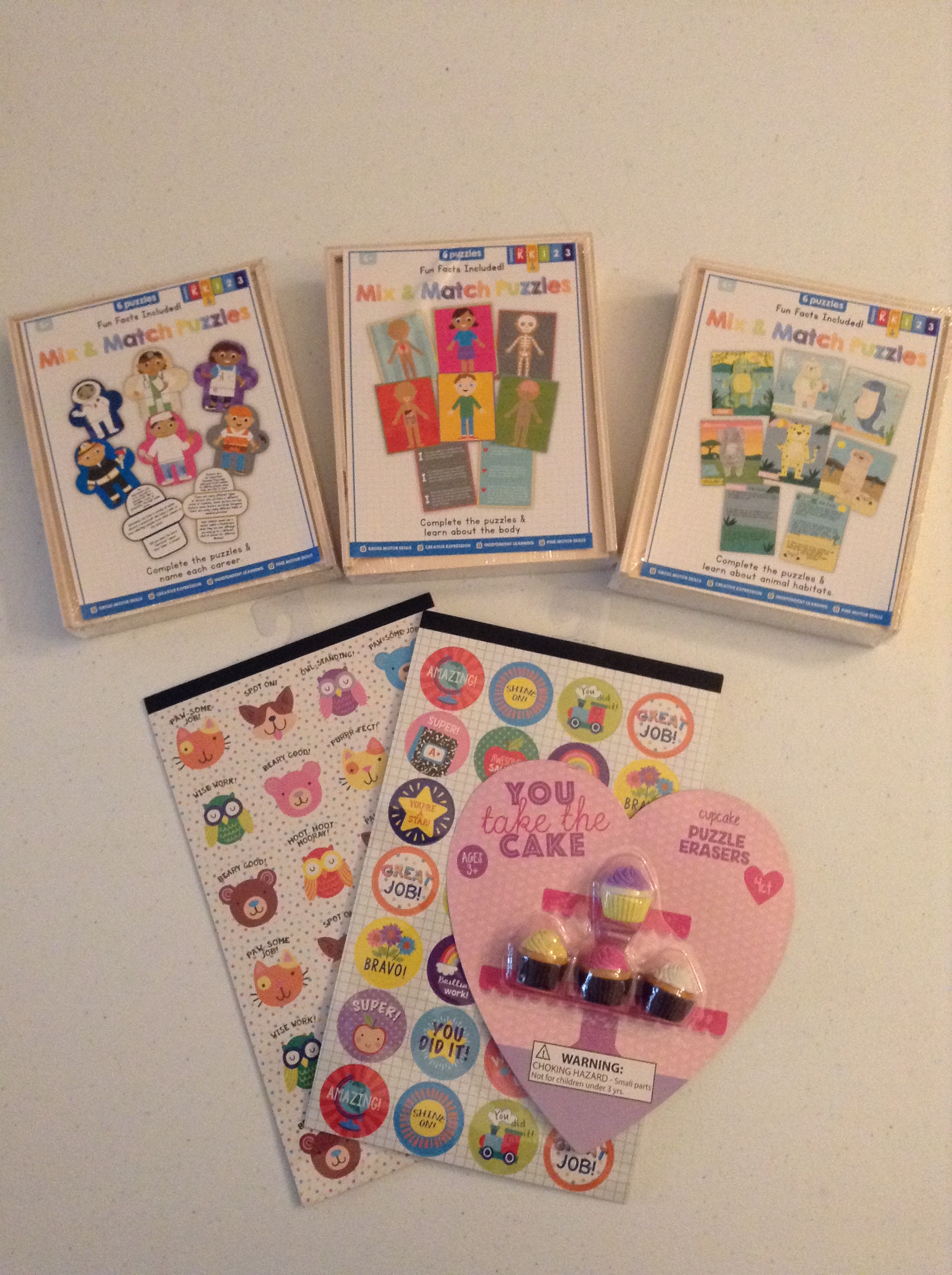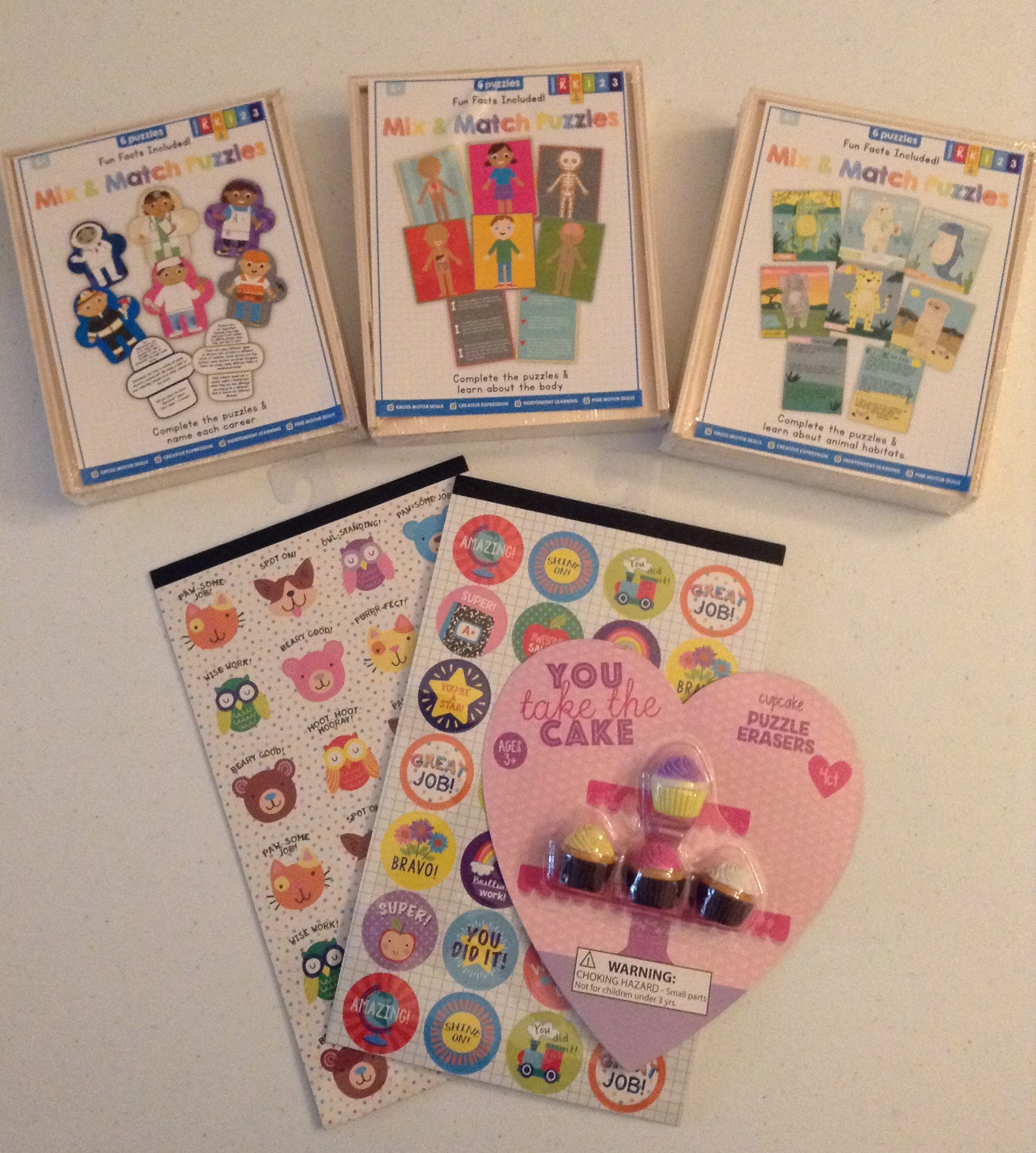 Look in the Dollar Spot. Now, I am aware that shopping in the Dollar Spot can cause you to buy things you had not planned on buying or go over budget on your shopping trip. However, sometimes there are great deals to find! This week I found stickers ($1 for each set) for grading, erasers ($1) to give as prizes to my students, and three wooden puzzles ($3 each) for my preK classroom!
