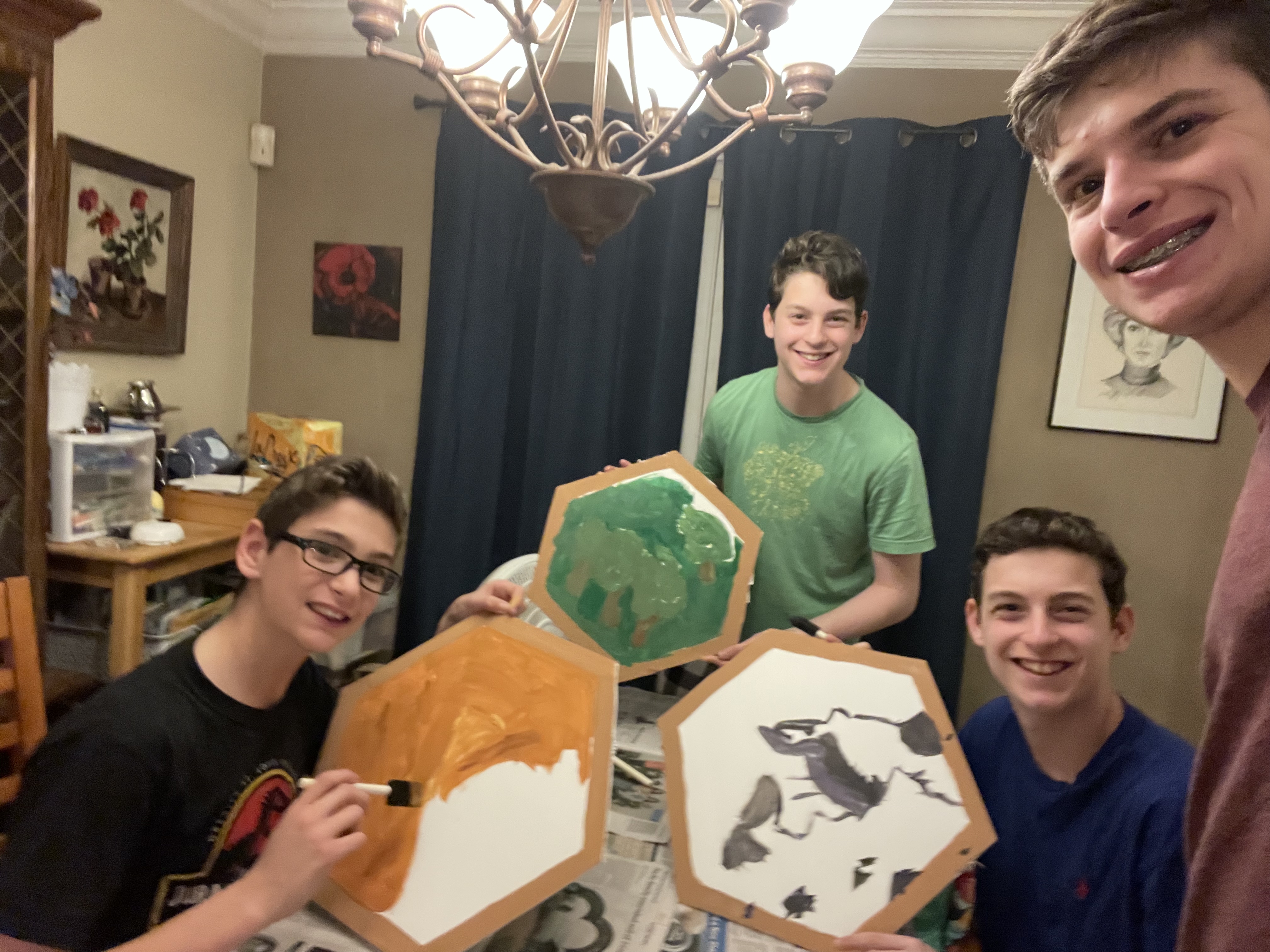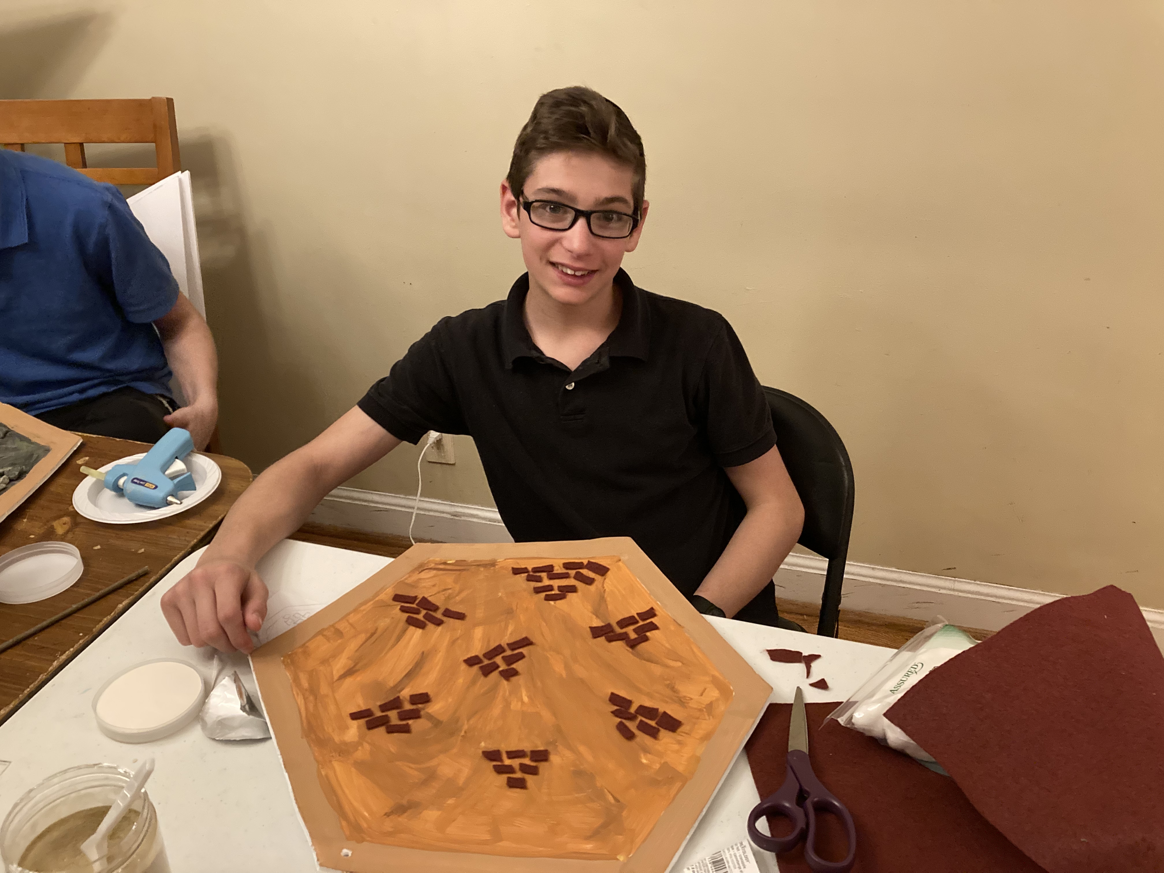 My husband cut the foam boards down to hexagons. He is great at technical things like this, so it was a great task to delegate! We had a family craft night and each of us painted our foam hexagon to match the resource piece from the game. We let them dry for a night before adding the other materials. We then glued on various items to again match each resource or piece (see above). We chose matching clothing as well. All items with an * were purchased at Michaels.