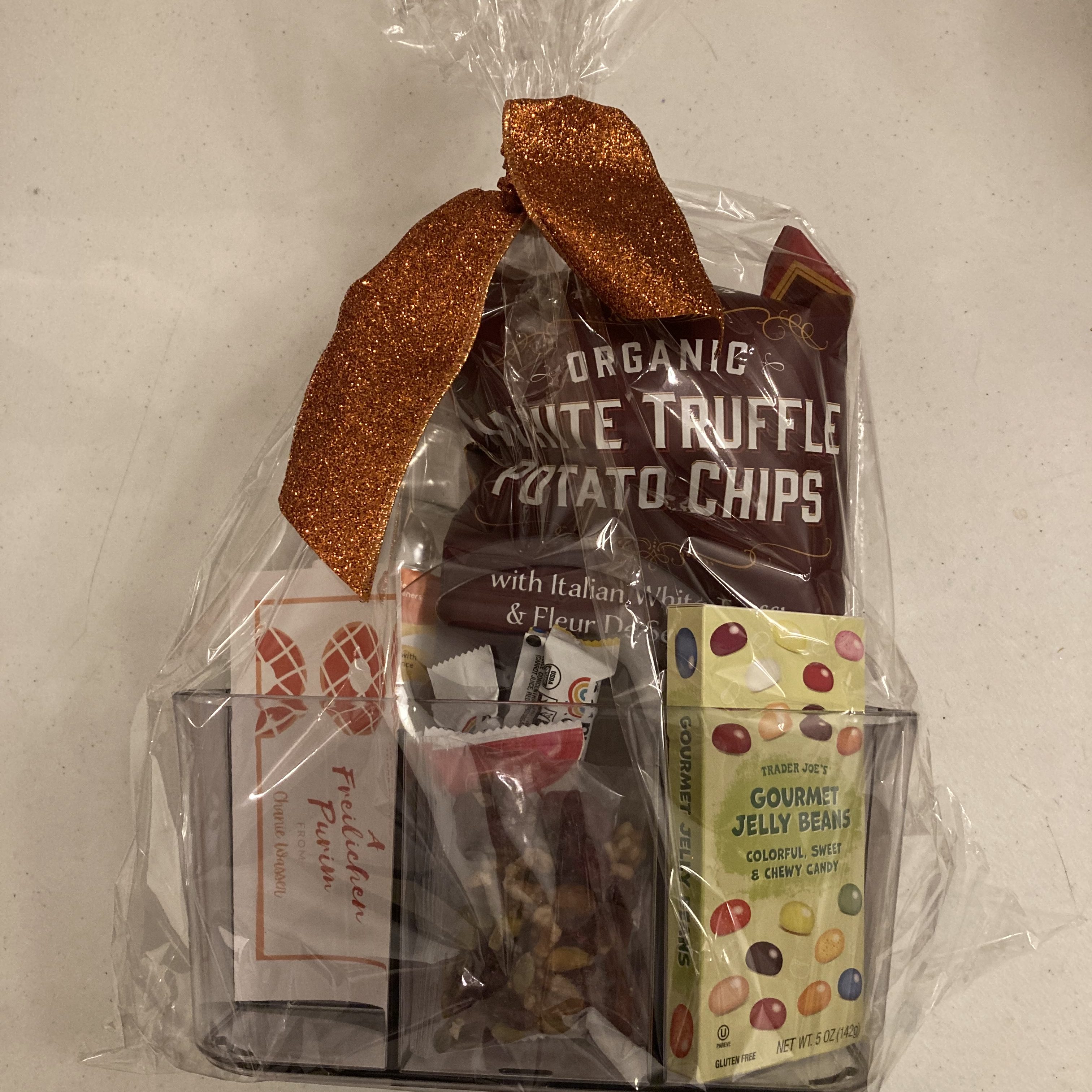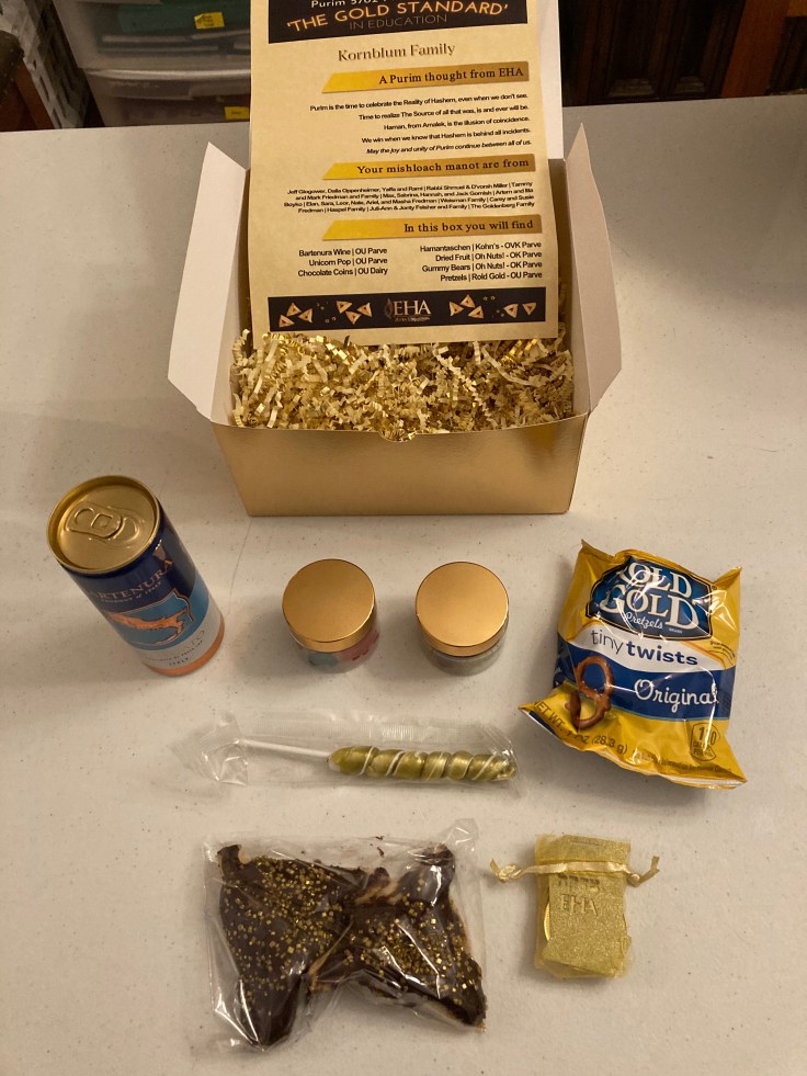 The Gold Standard – Our younger boys’ school made shaloch manos relating to their theme of the “Gold Standard in Education.” It included a can of Bartenura wine, a unicorn pop, chocolate coins, gold-sprinkled hamantashen, dried fruit, gummy bears, and Rolled Gold pretzels. The packaging and gold touches made for a beautiful presentation, too!