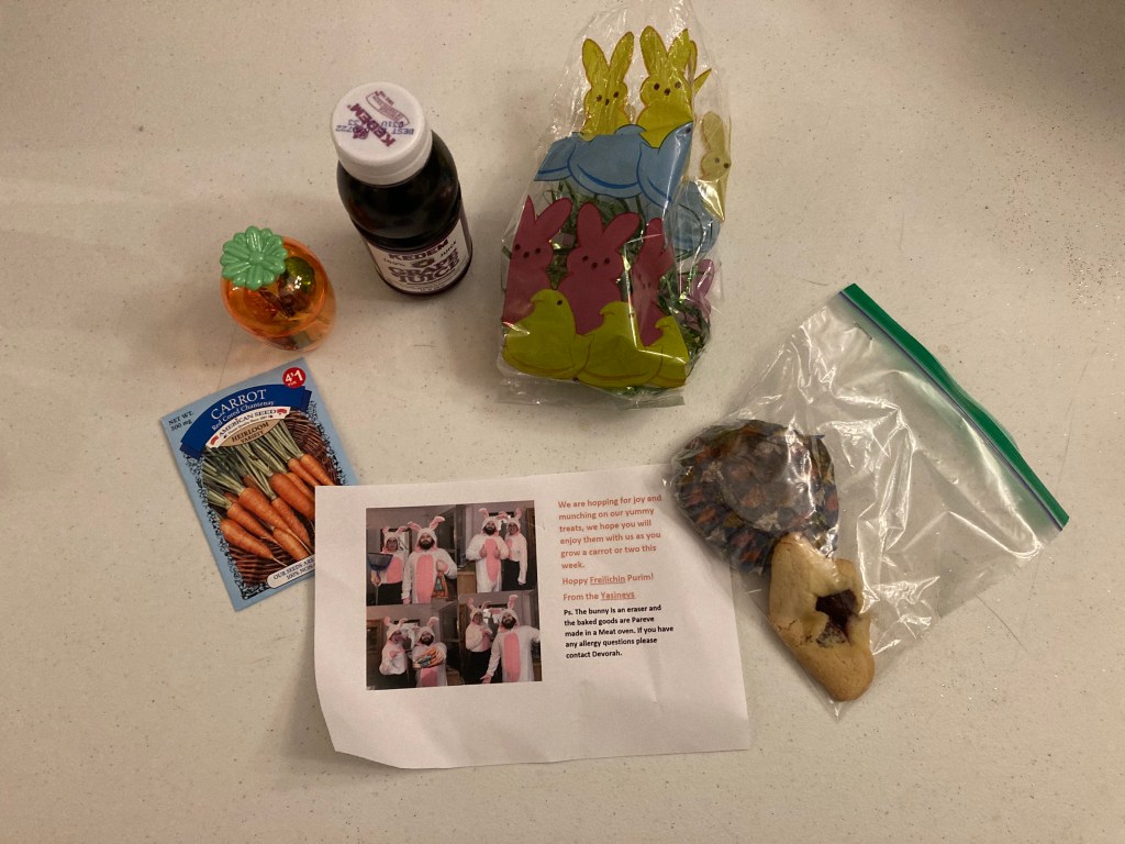 Bunny – Our friends Devora & Jonathan dressed up as bunnies and gave their friends a bunny eraser, carrot container, grape juice, carrot seeds, and baked goods.