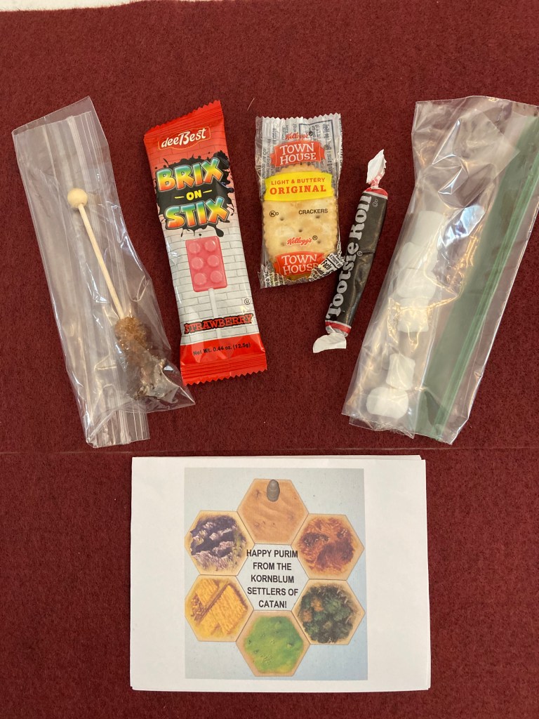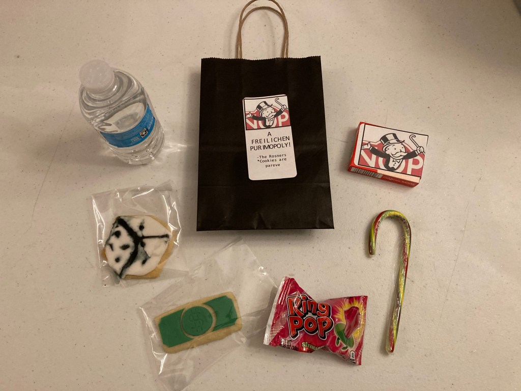 Purimopoly – R’ Mendy & Daniela created a very original Purim version of Monopoly! Their homemade cookies were delicious and beautiful! They included raisins, a colorful candy cane, a ring pop, homemade cookies, and water.