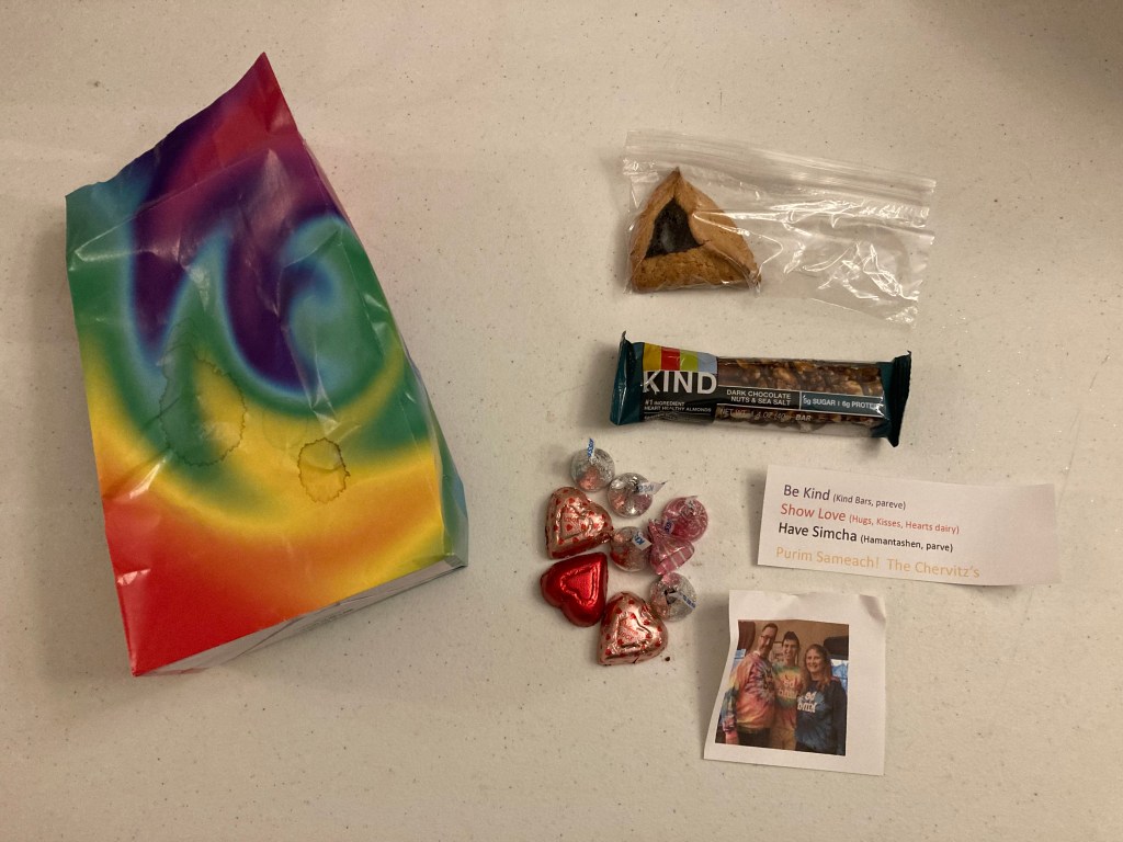 Be Kind – Our friends Vicki & Marc made their shaloch manos coordinate with a great motto to live by. They included Kind bars (Being kind), Hugs and Kisses (Show love), and hamantashen (Have simcha). They wore matching “Be Kind” tie-dye shirts.