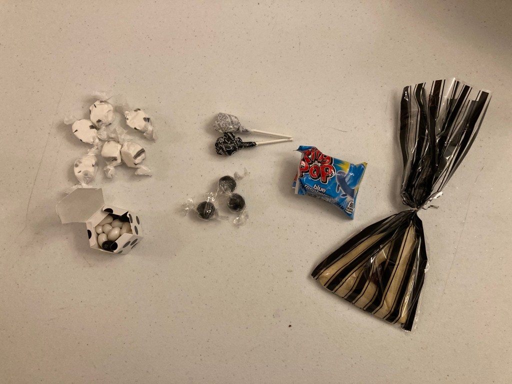 Wedding (Black & White) – R’ Yitz & Racheli made a very elegant shaloch manos with a beautiful card, too! They included black and white taffy, jelly beans, lollipops, gumballs, a hamantashen, and a ring pop.