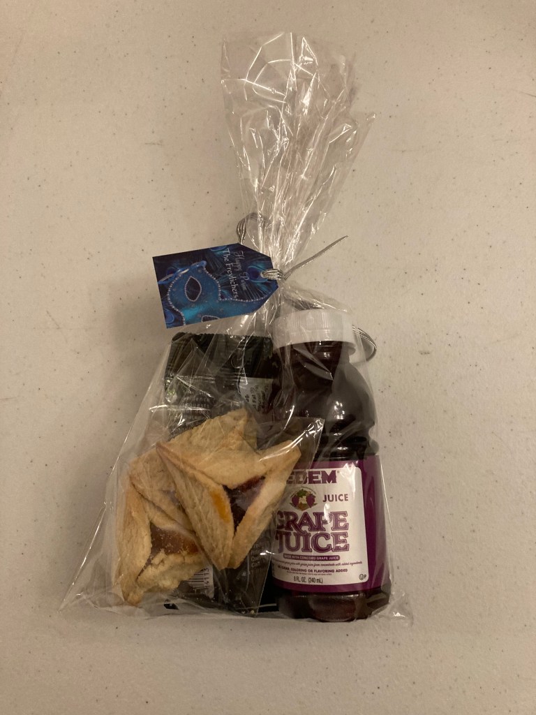 Reaching everyone – Our Early Childhood director at the school where I work made shaloch manos for the Early Childhood staff with the inscription: “To the Morah who reaches everyone – the sweet, the salty, the crunchy, the soft, the bubbly – thank you for all you do!” She included chips, fruit bars, fruit/nut mix, fruit leather, and Trader Joe’s jelly beans in a beautiful utensil sorter. So clever!