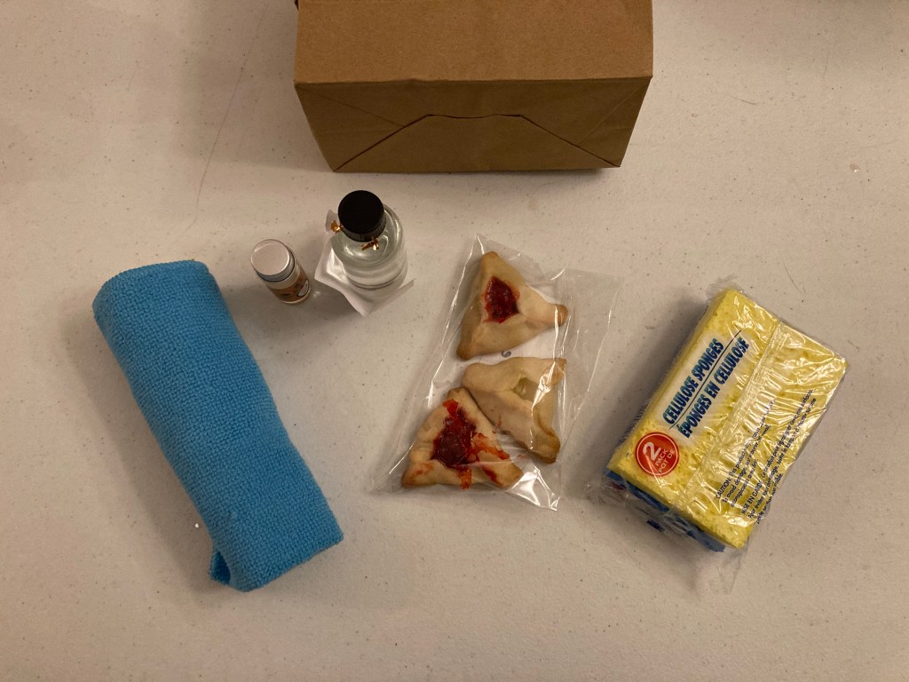 Ukraine – Our friends Angela & Tzvi made their shaloch manos in honor of Ukraine, complete with products from the country: a sponge, hamantashen, vodka, a duster cloth, and sunflower oil.