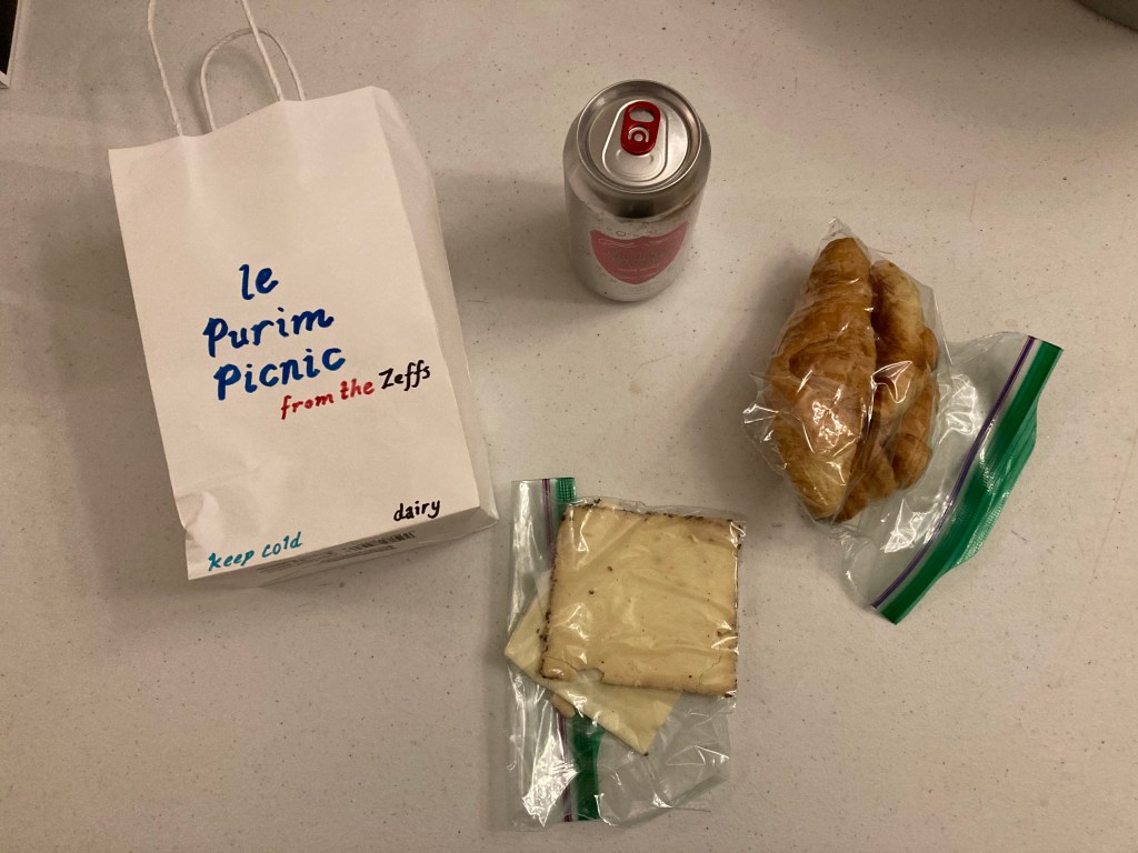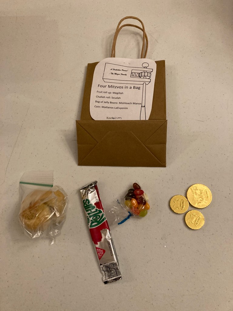 Four mitzvos in a bag – Tzipporah & R’ Binyomin focused on the major components of the holiday including a fruit roll up for megillah, challah roll for the seuda, a bag of jelly beans for mishloach manos, and chocolate coins for mattanos l’evyonim. Very clever!