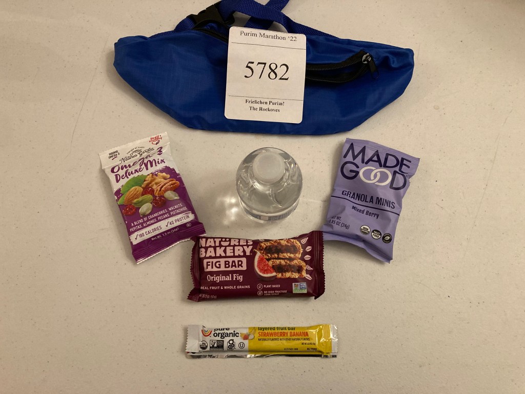 Marathon runners – R’ Gershon & Shayna included everything a runner might need for before and after a run – a fig bar, a fruit leather, trail mix, water, and granola bites.