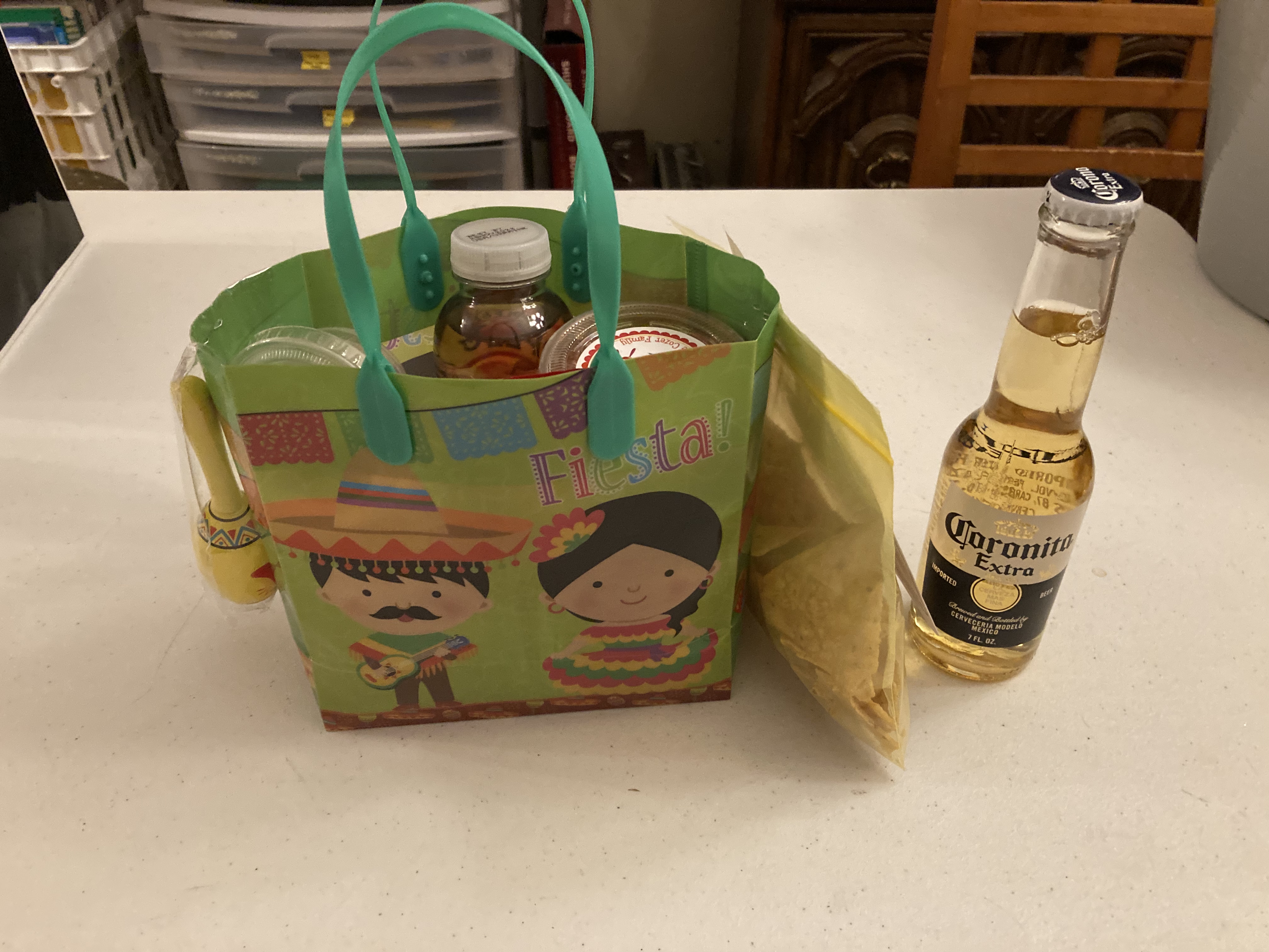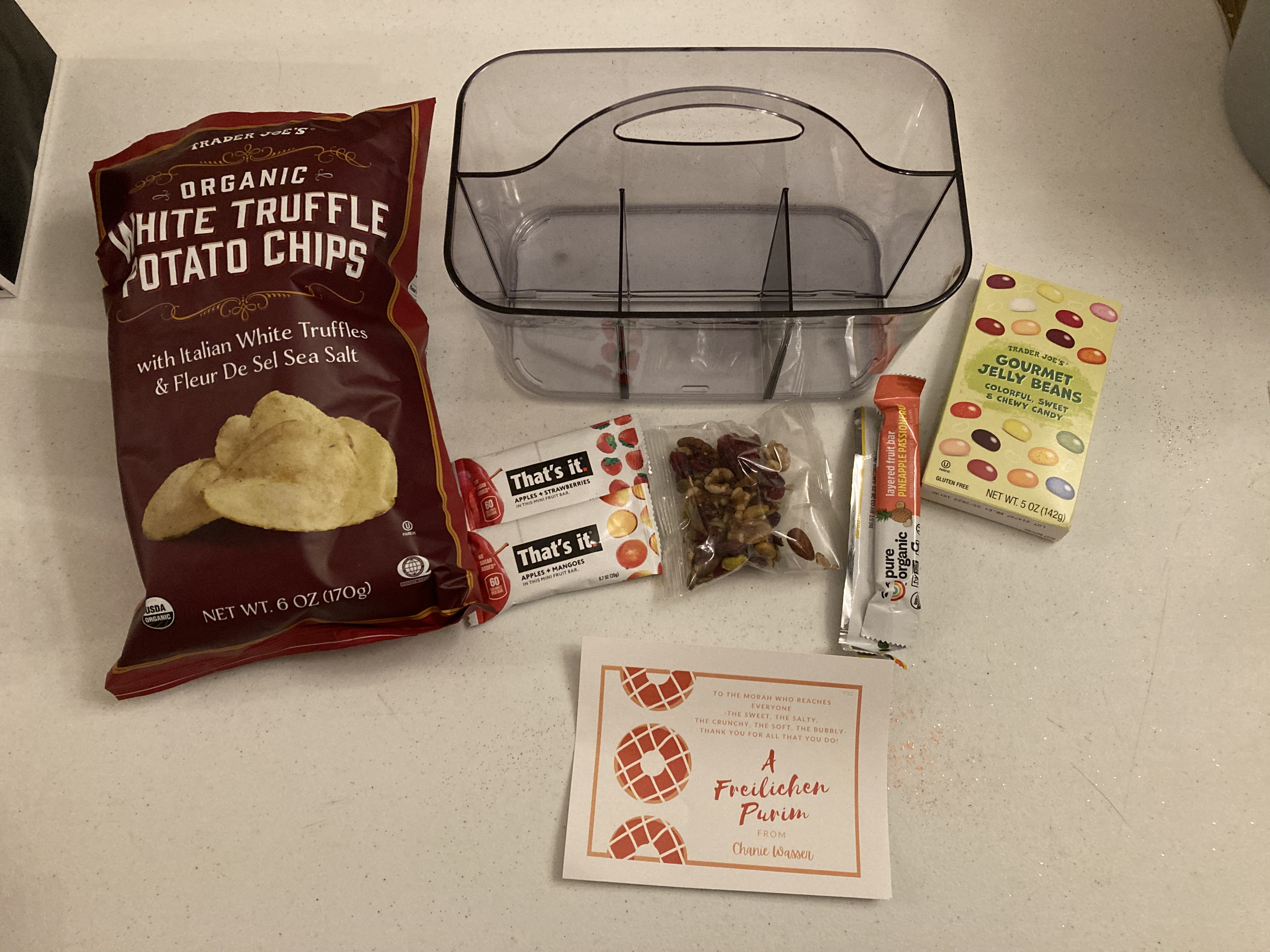 Reaching everyone – Our Early Childhood director at the school where I work made shaloch manos for the Early Childhood staff with the inscription: “To the Morah who reaches everyone – the sweet, the salty, the crunchy, the soft, the bubbly – thank you for all you do!” She included chips, fruit bars, fruit/nut mix, fruit leather, and Trader Joe’s jelly beans in a beautiful utensil sorter. So clever!