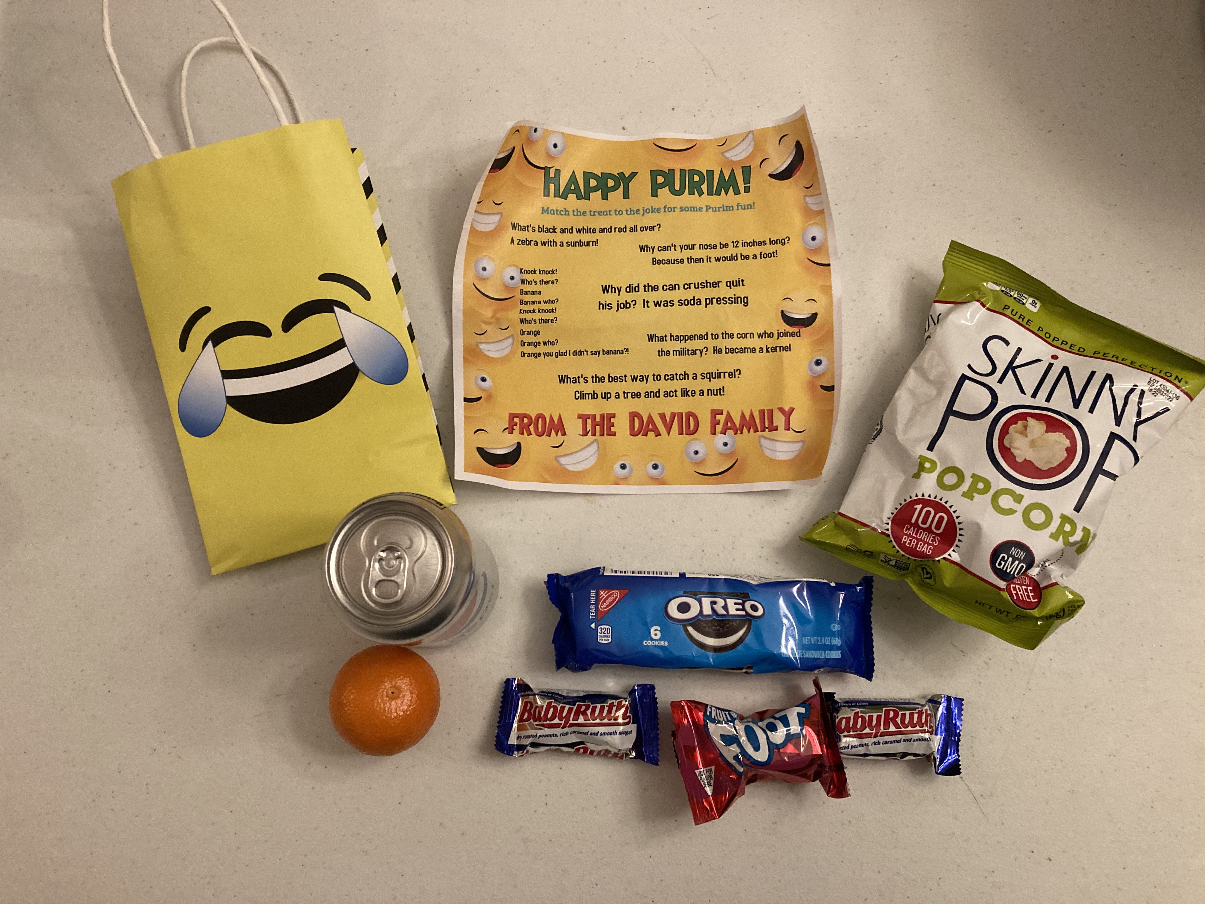 Jokes – R’ Yosef & Mimi created a very clever joke-themed shaloch manos with foods matching each of the jokes they included!