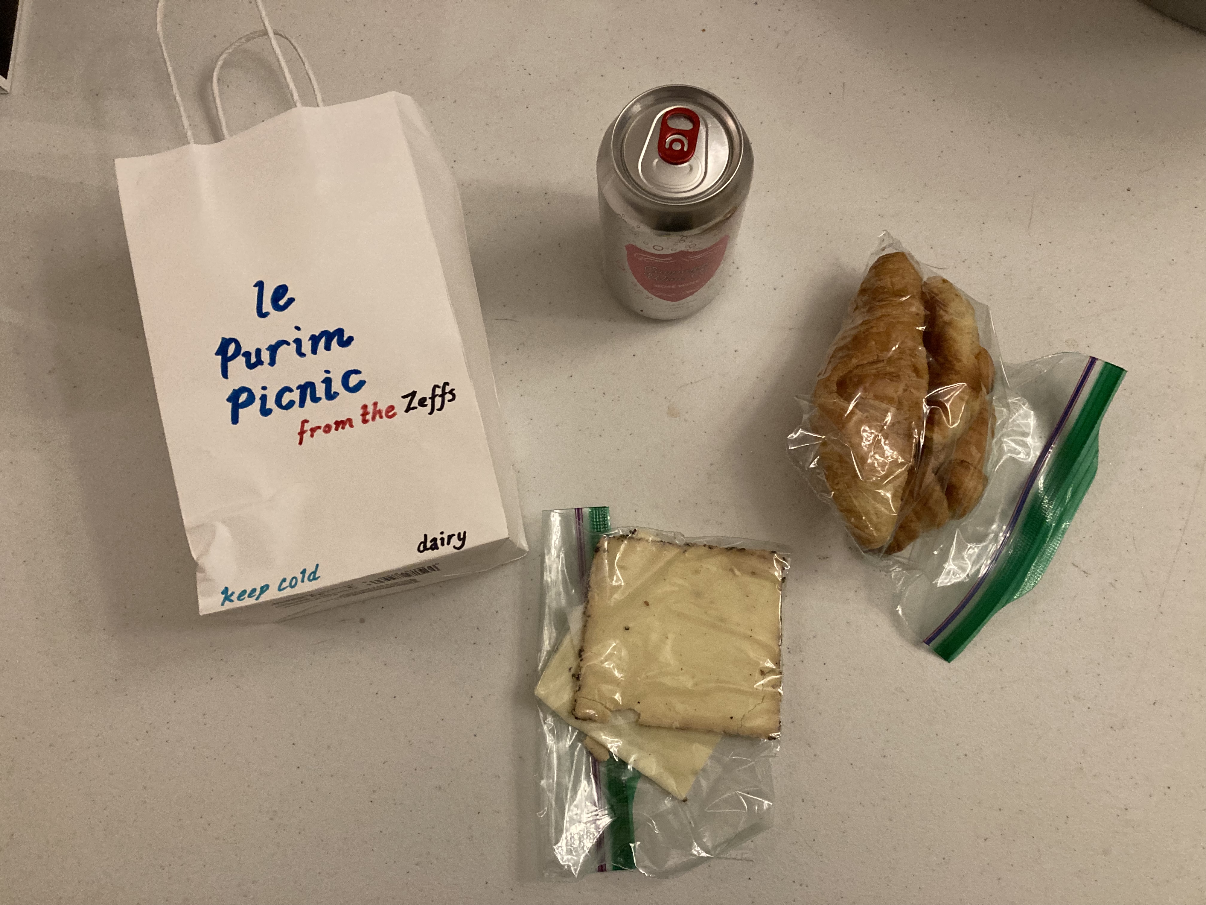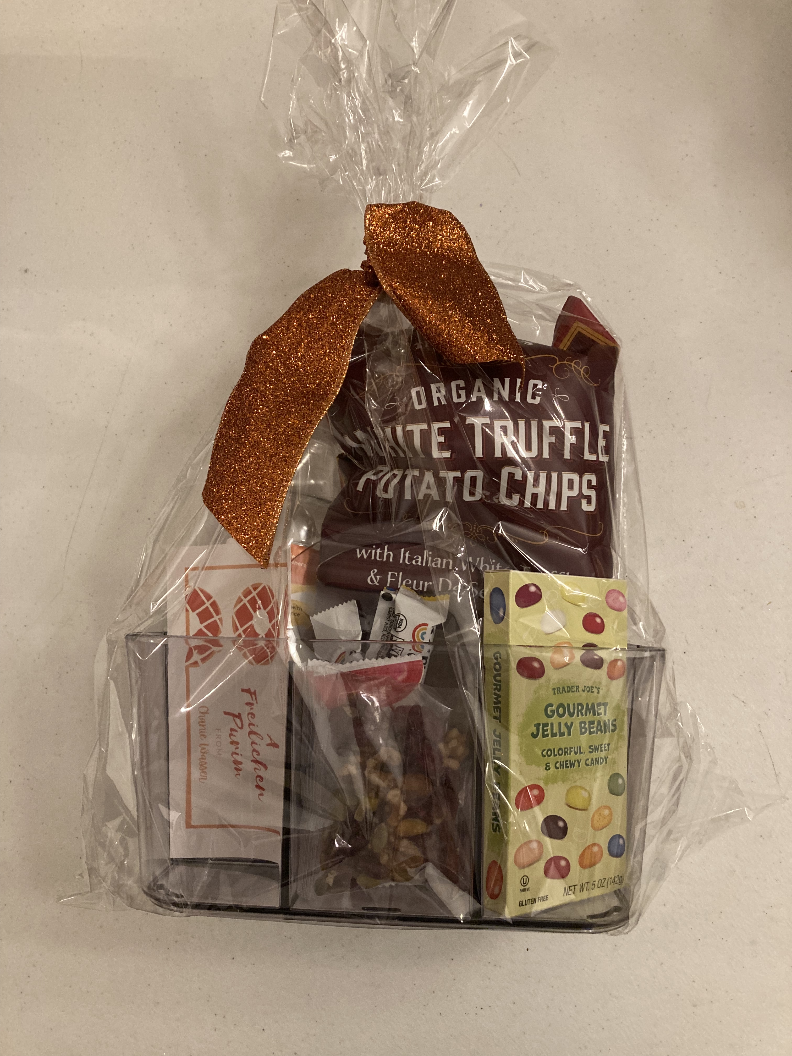 The Gold Standard – Our younger boys’ school made shaloch manos relating to their theme of the “Gold Standard in Education.” It included a can of Bartenura wine, a unicorn pop, chocolate coins, gold-sprinkled hamantashen, dried fruit, gummy bears, and Rolled Gold pretzels. The packaging and gold touches made for a beautiful presentation, too!