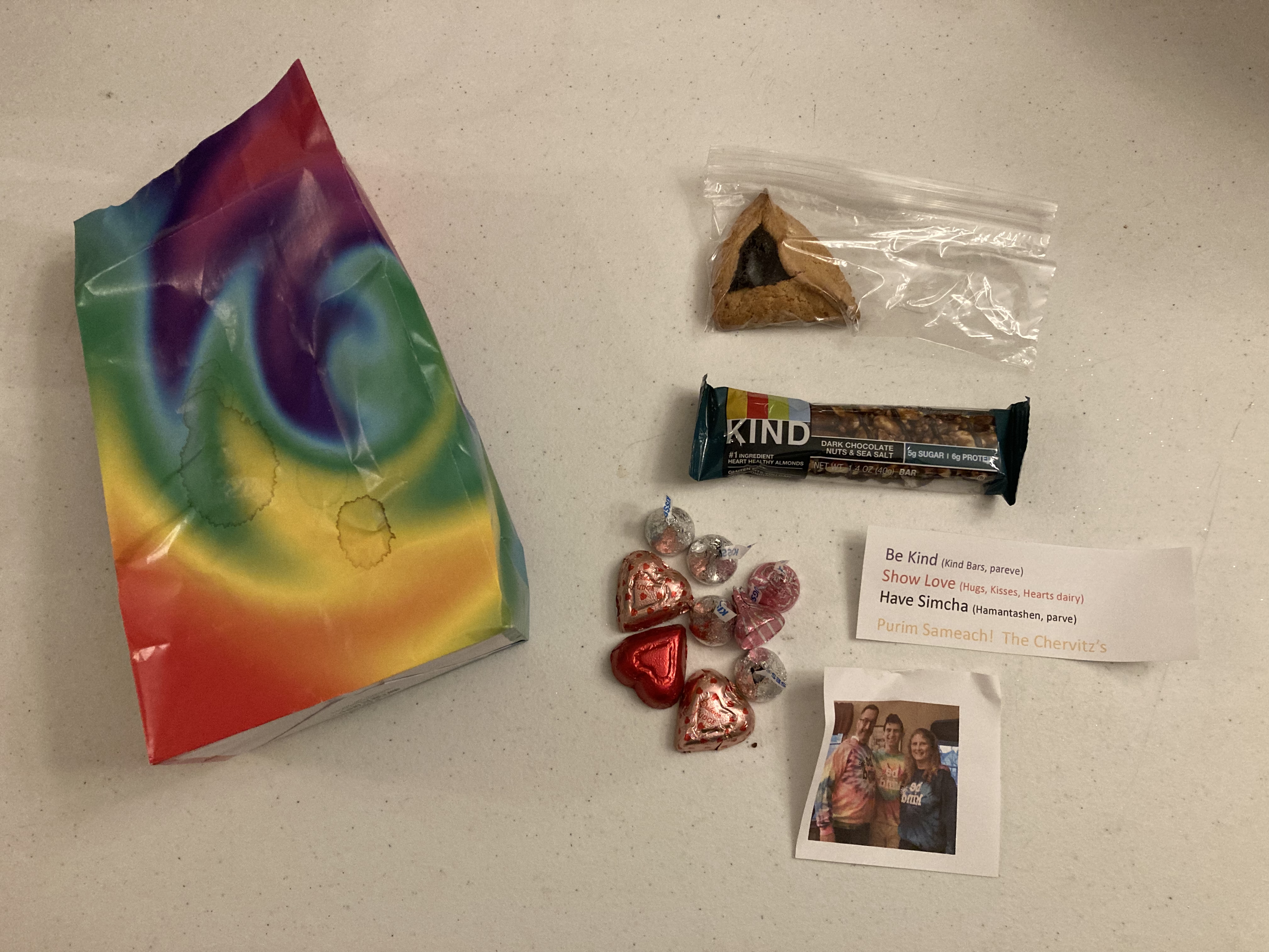 Be Kind – Our friends Vicki & Marc made their shaloch manos coordinate with a great motto to live by. They included Kind bars (Being kind), Hugs and Kisses (Show love), and hamantashen (Have simcha). They wore matching “Be Kind” tie-dye shirts.