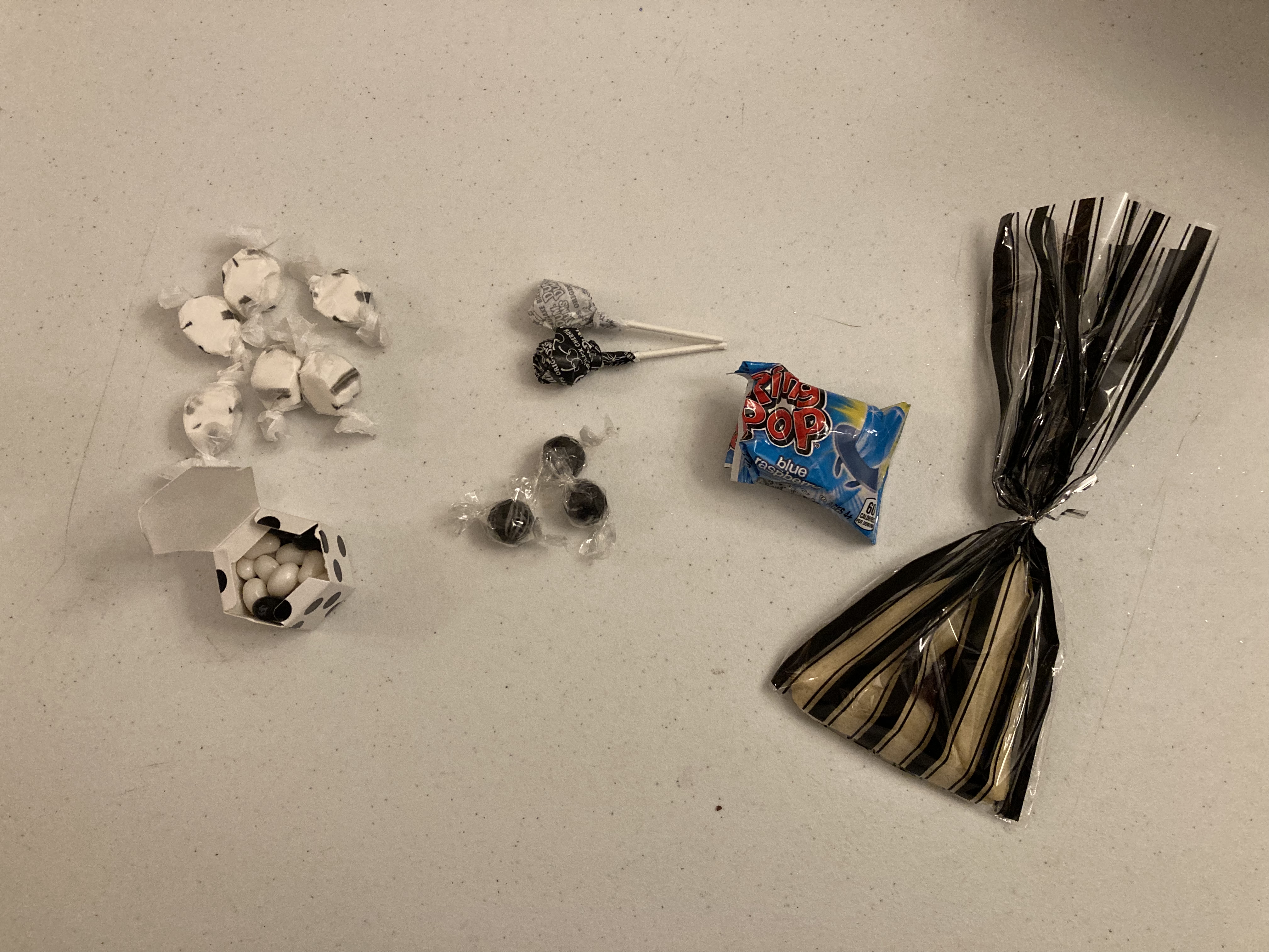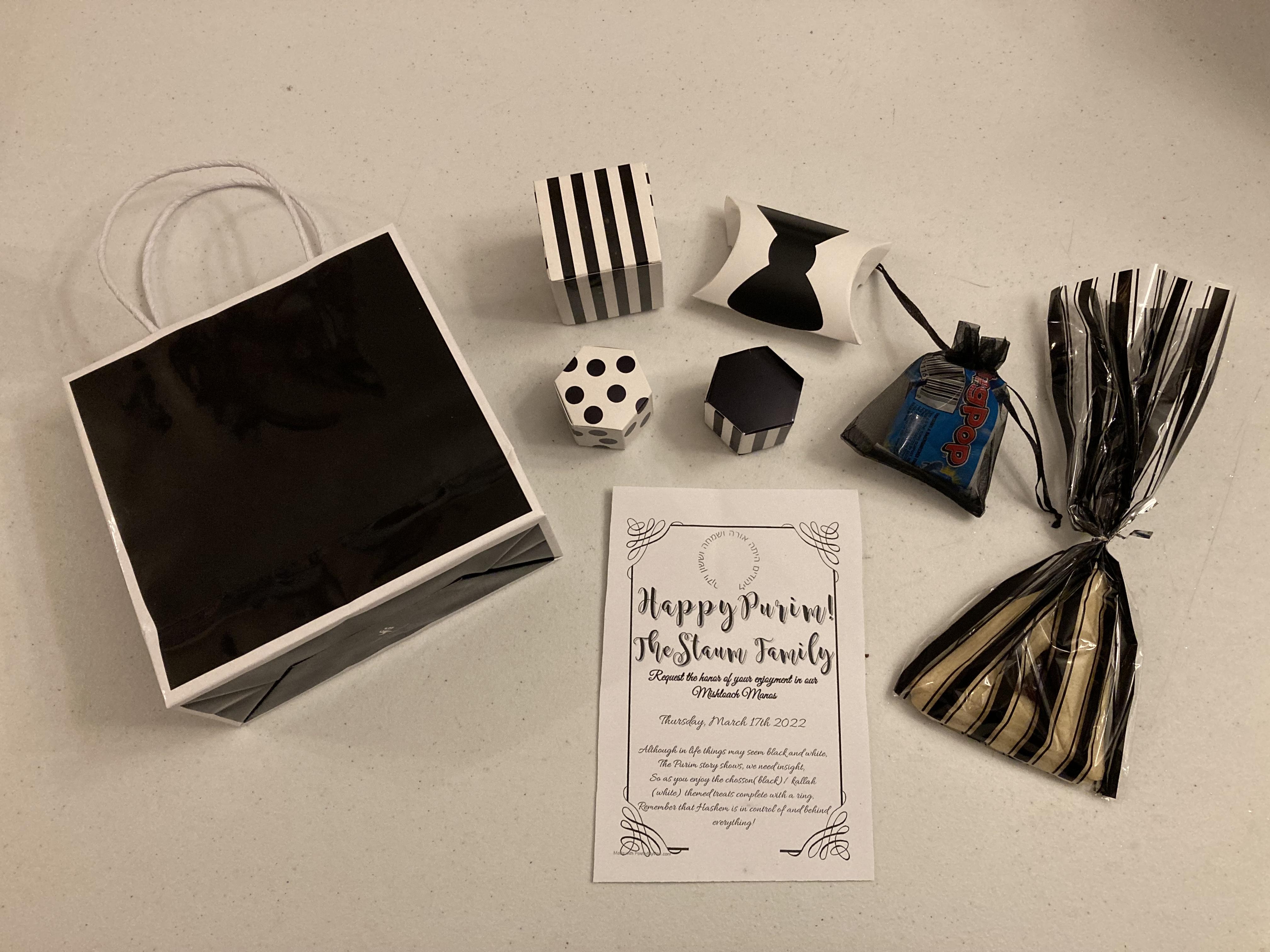 Wedding (Black & White) – R’ Yitz & Racheli made a very elegant shaloch manos with a beautiful card, too! They included black and white taffy, jelly beans, lollipops, gumballs, a hamantashen, and a ring pop.