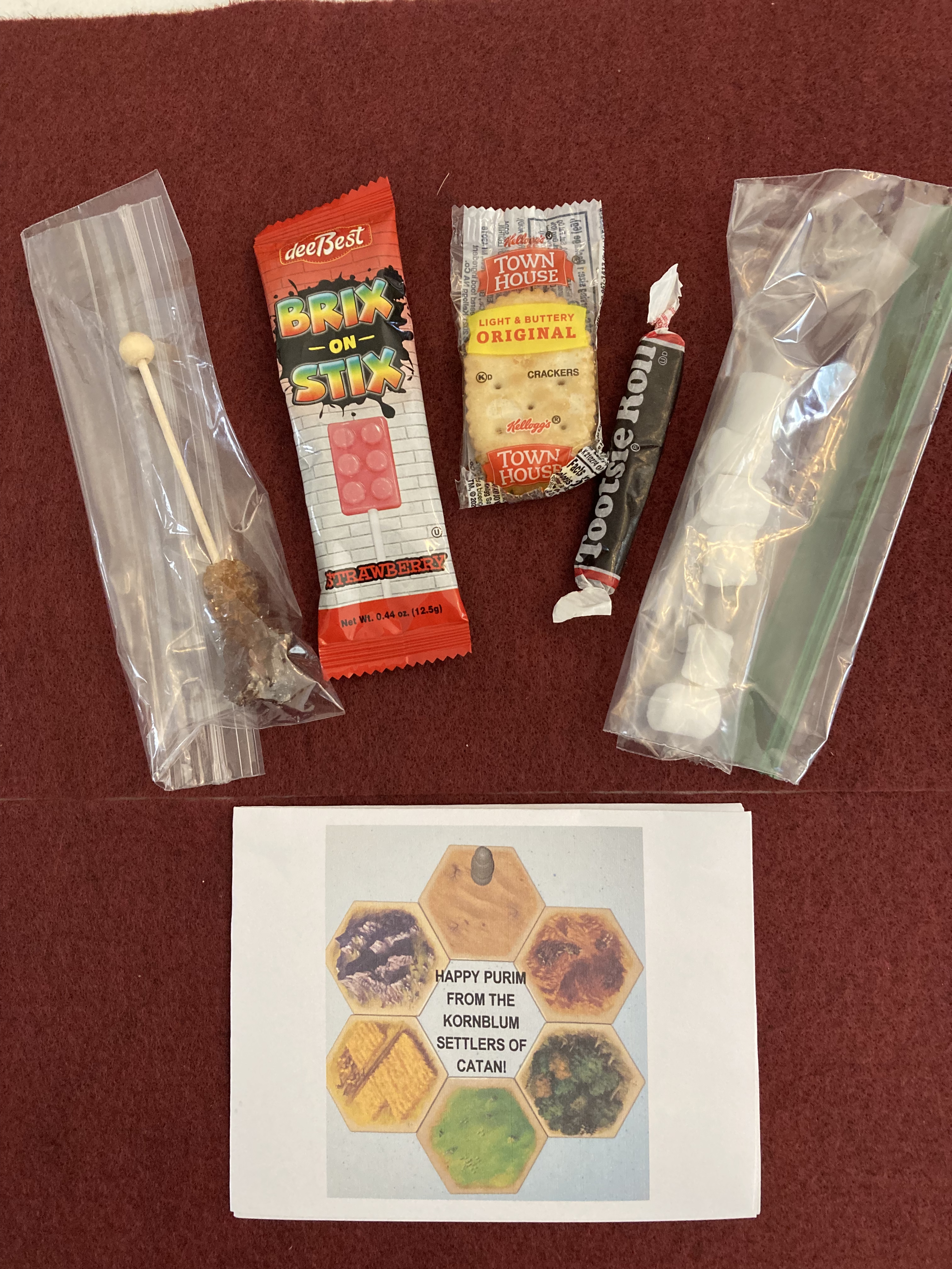 Purimopoly – R’ Mendy & Daniela created a very original Purim version of Monopoly! Their homemade cookies were delicious and beautiful! They included raisins, a colorful candy cane, a ring pop, homemade cookies, and water.