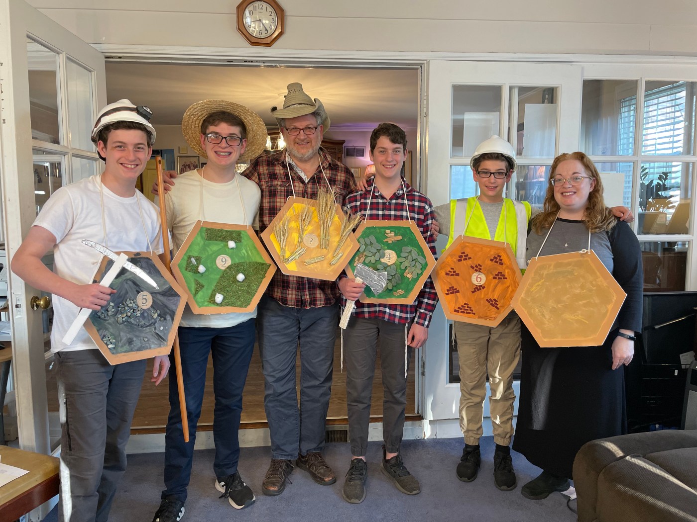My husband cut the foam boards down to hexagons. He is great at technical things like this, so it was a great task to delegate! We had a family craft night and each of us painted our foam hexagon to match the resource piece from the game. We let them dry for a night before adding the other materials. We then glued on various items to again match each resource or piece (see above). We chose matching clothing as well. All items with an * were purchased at Michaels.