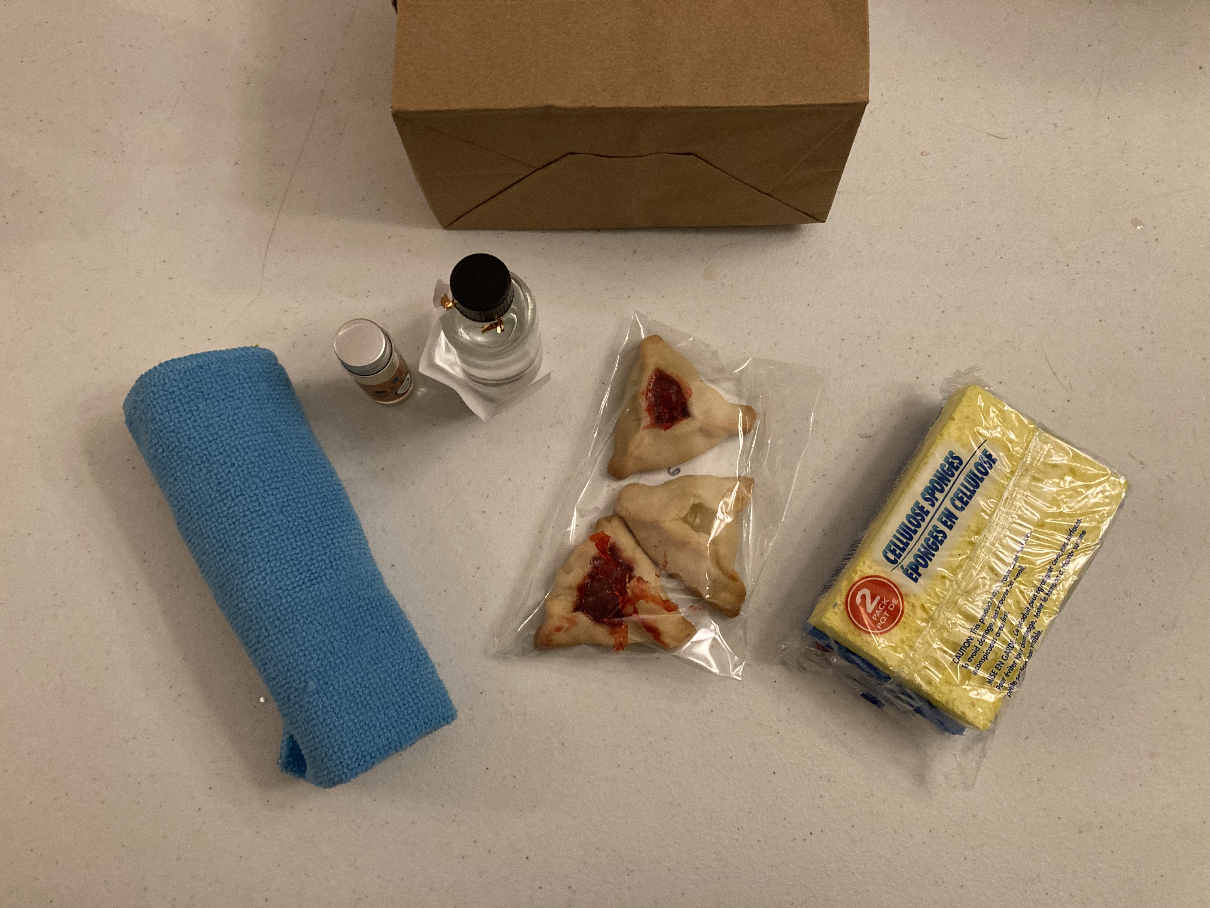 Ukraine – Our friends Angela & Tzvi made their shaloch manos in honor of Ukraine, complete with products from the country: a sponge, hamantashen, vodka, a duster cloth, and sunflower oil.