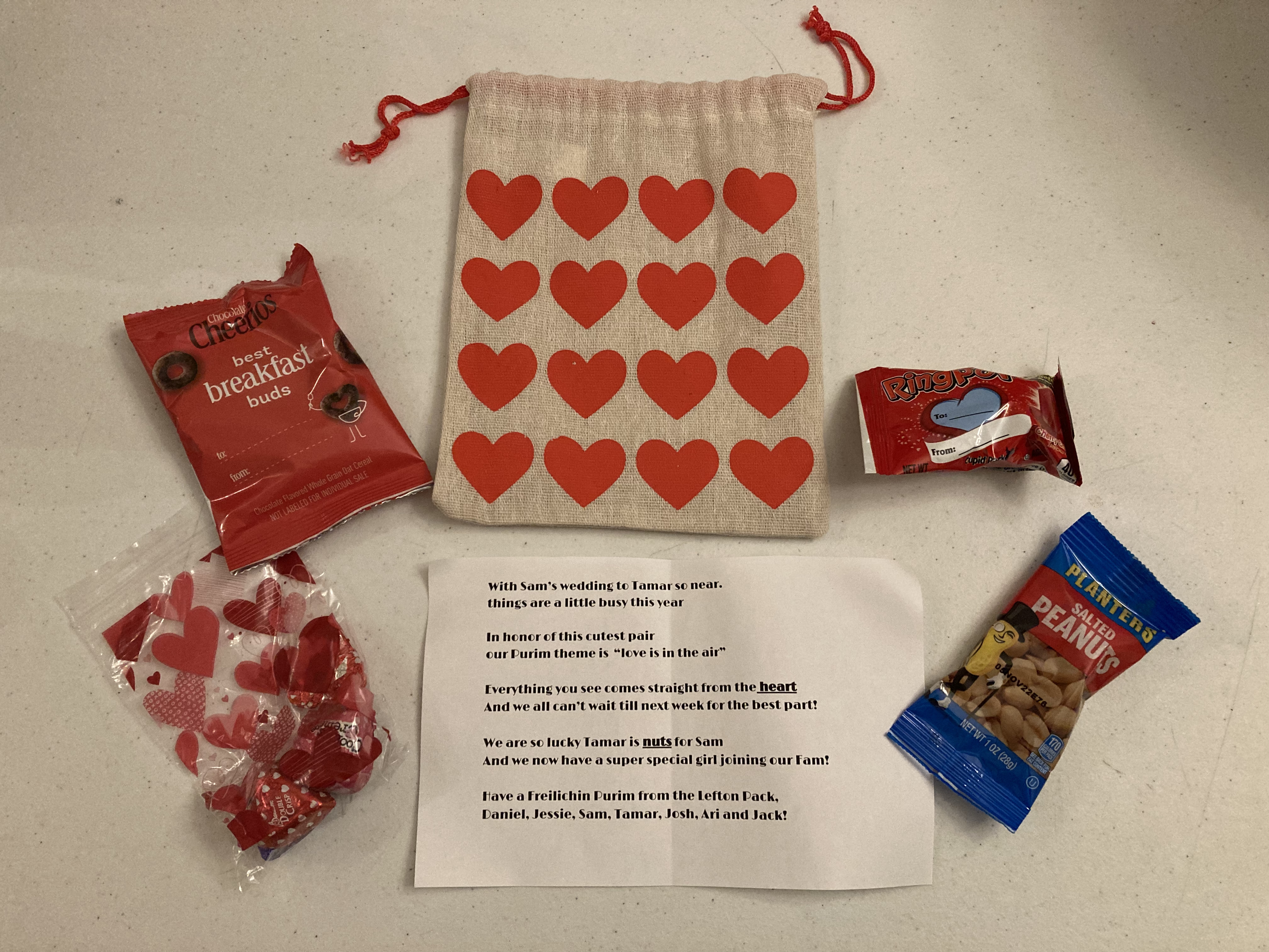 Love is in the air – Jessie & Daniel were planning a wedding for one of their children, so the love theme seemed appropriate. They chose heart-shaped items and nuts to go along with the poem they wrote for the occasion.