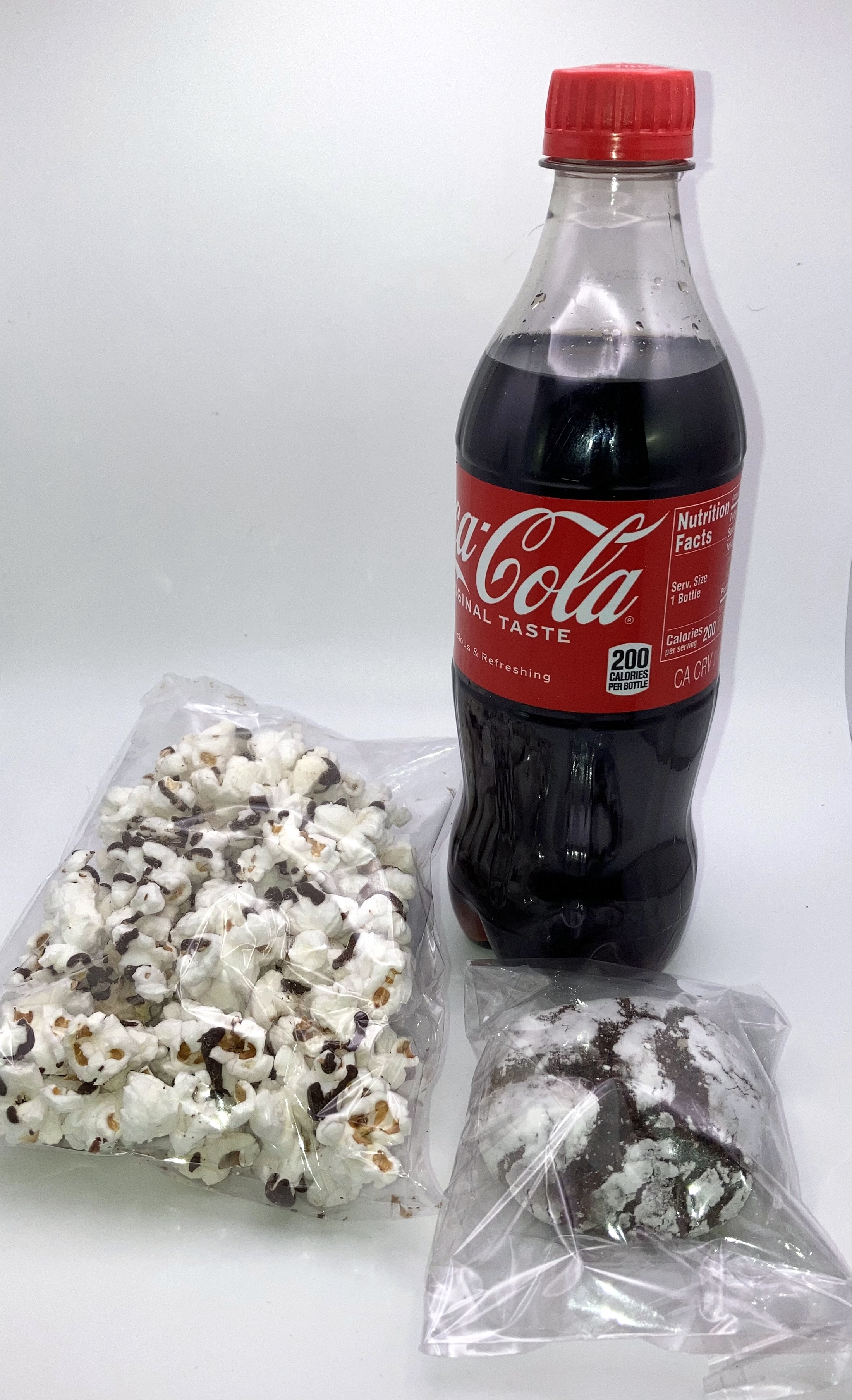 Mimes – Our neighbors, R’ Daniel & Rochel made a mime-themed shaloch manos that stuck to the color-theme of a mime costume. They included chocolate-drizzled popcorn, chocolate crinkle cookies, and a Coke.