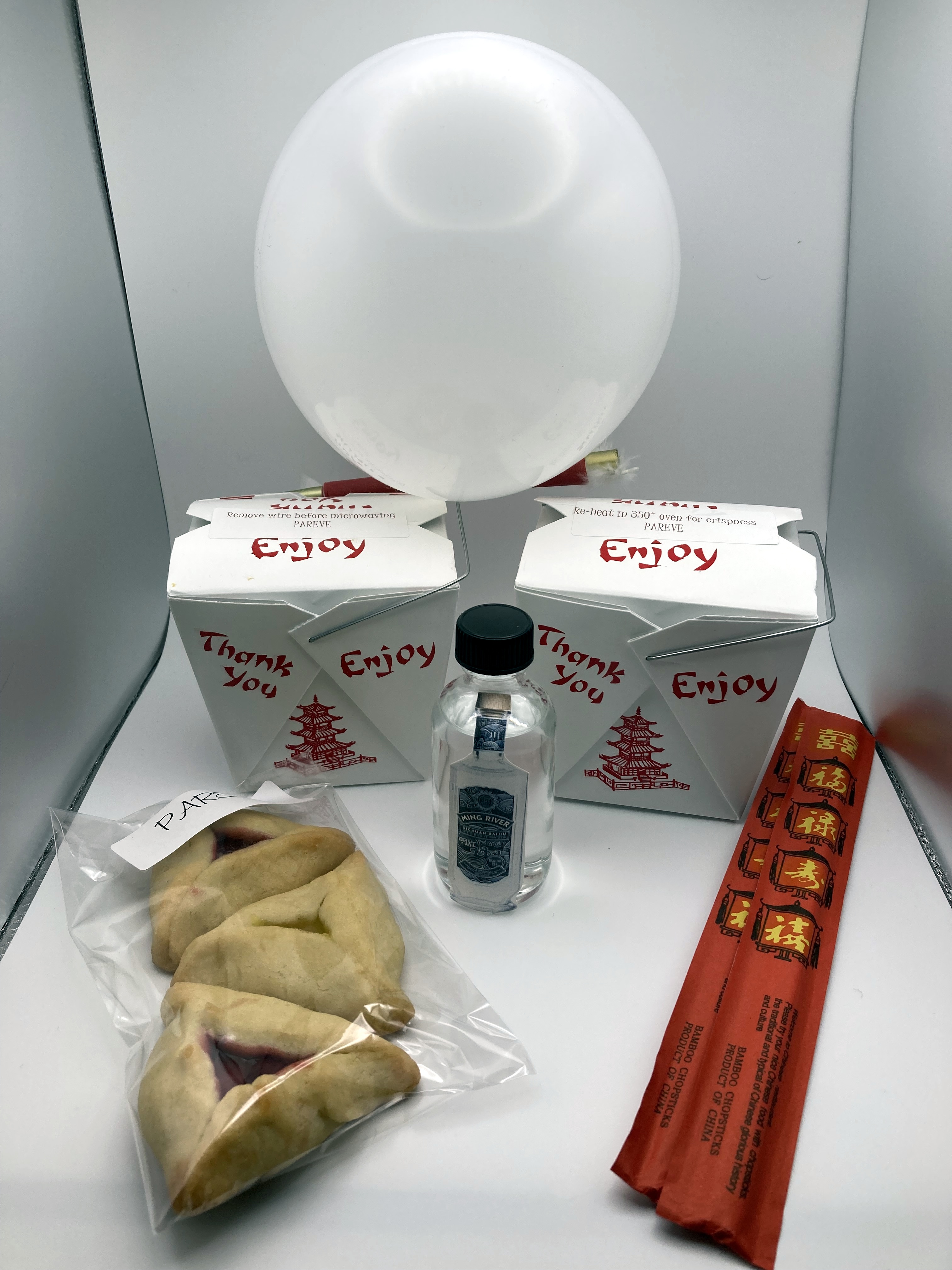 China – Our friends Angela & Tzvi have come up with some very clever and delicious country themes over the years. This year included yummy homemade Chinese food, chopsticks, Chinese liquor, hamantashen, and a balloon (related to the time’s current events).