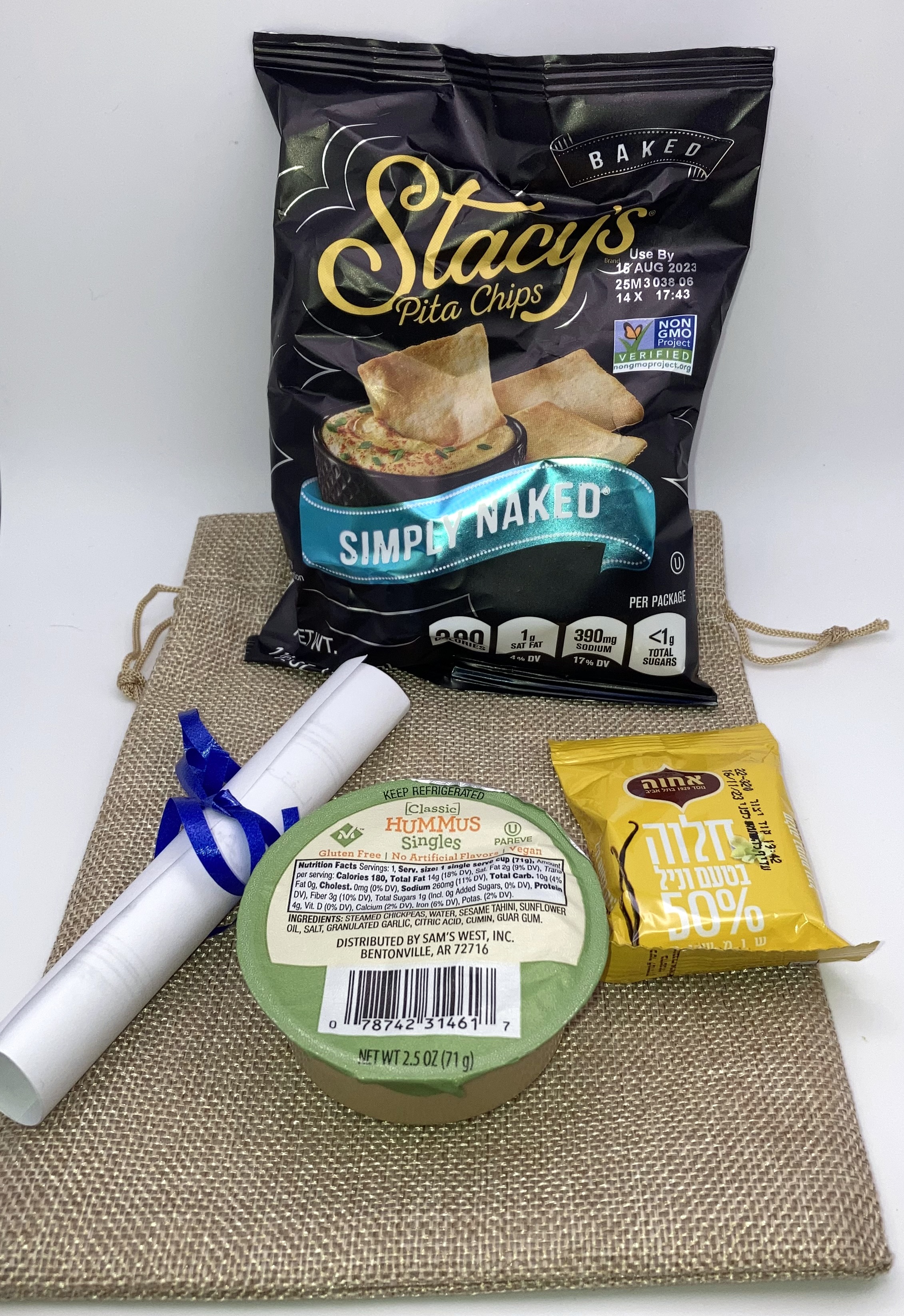Arabic – R ‘ Yosef & Mimi created an Arabic/Israeli themed shaloch manos with several favorites – hummus, pita chips, and halvah in a burlap bag. Yum!