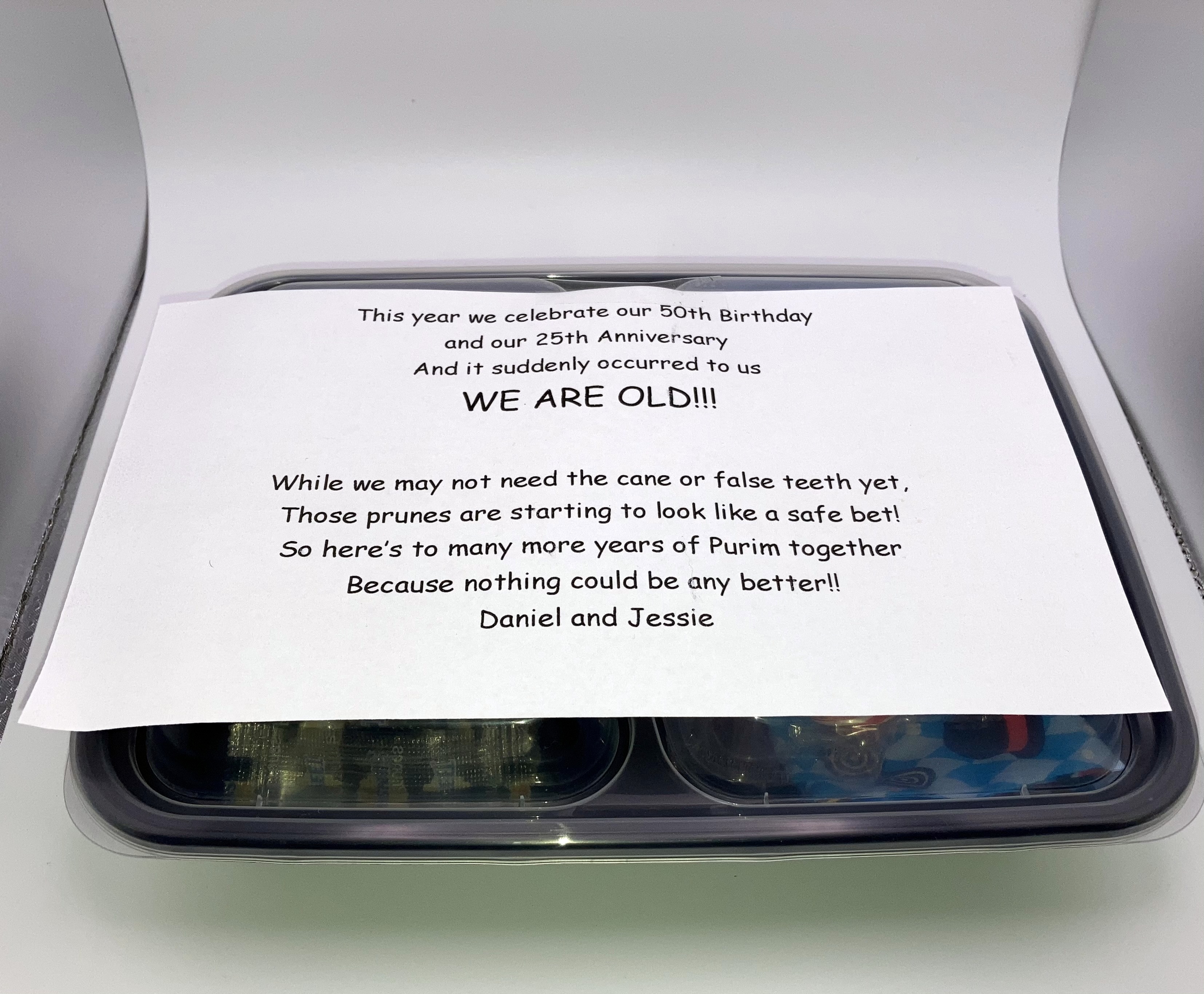 Old people – Our friends Jessie & Daniel are always super creative with their shaloch manos (even writing clever poems). Some ideas I have even used as inspiration for teaching! This year they focused on being “old,” since they turned 50 and had a 25th anniversary. They included wax teeth, prunes, and candy “canes.”