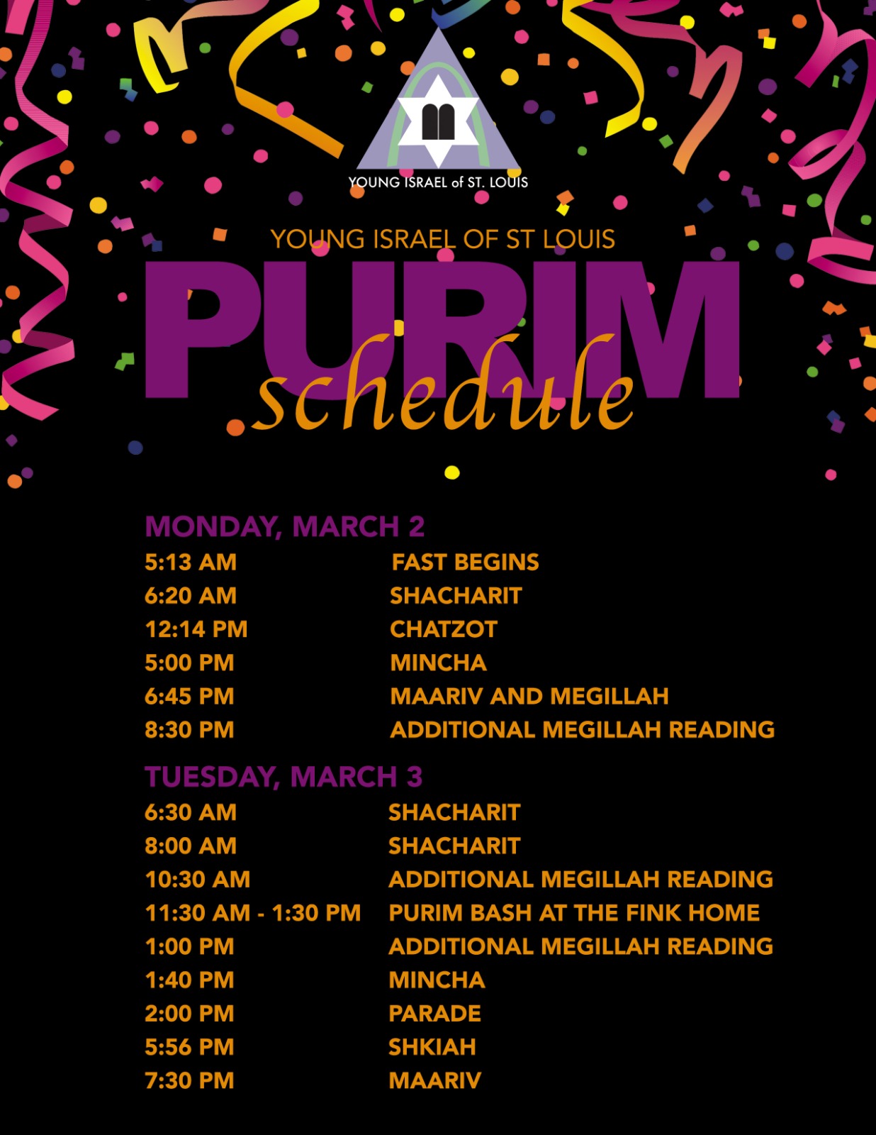 6:20 p.m. – Ma’ariv followed by Megillah reading at approximately 6:37 p.m., U. City Shul
